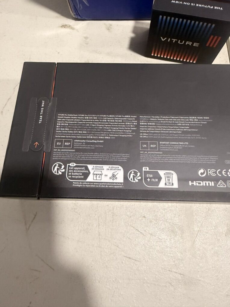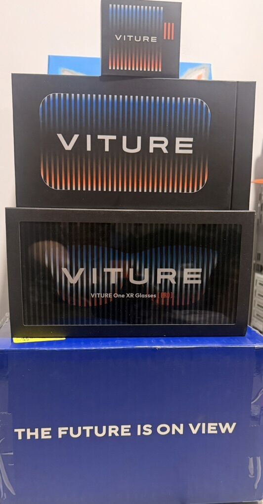 These are the Viture AR Glasses, glasses that connect to any compatible device via USB-C and create a cinema-like screen using augmented reality (AR) technology. They're still in the box, and I've only used them a couple of times, just updated and tested, then put them back and never used. This bundle includes the Nintendo Switch power bank adapter and a power adapter for extra battery life. All the manuals are still included, and the cable is in the hidden compartment of the case. This bundle new would cost you well over $600.