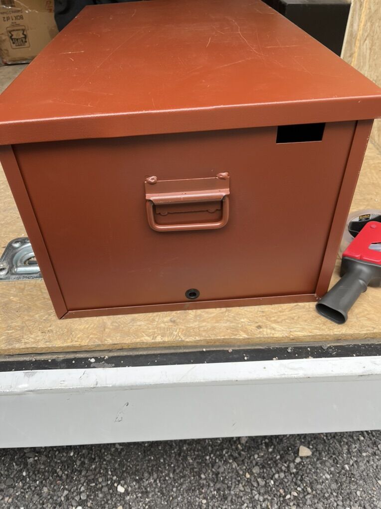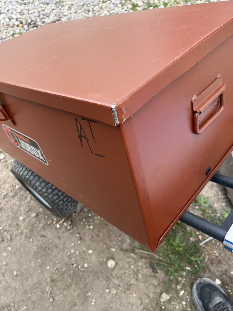 Staked and Welded Hinges Welded Corner Gussets 10-Gauge Latching Hasp Wide Lifting Handles Textured Powder Paint Finish Couple scratches.