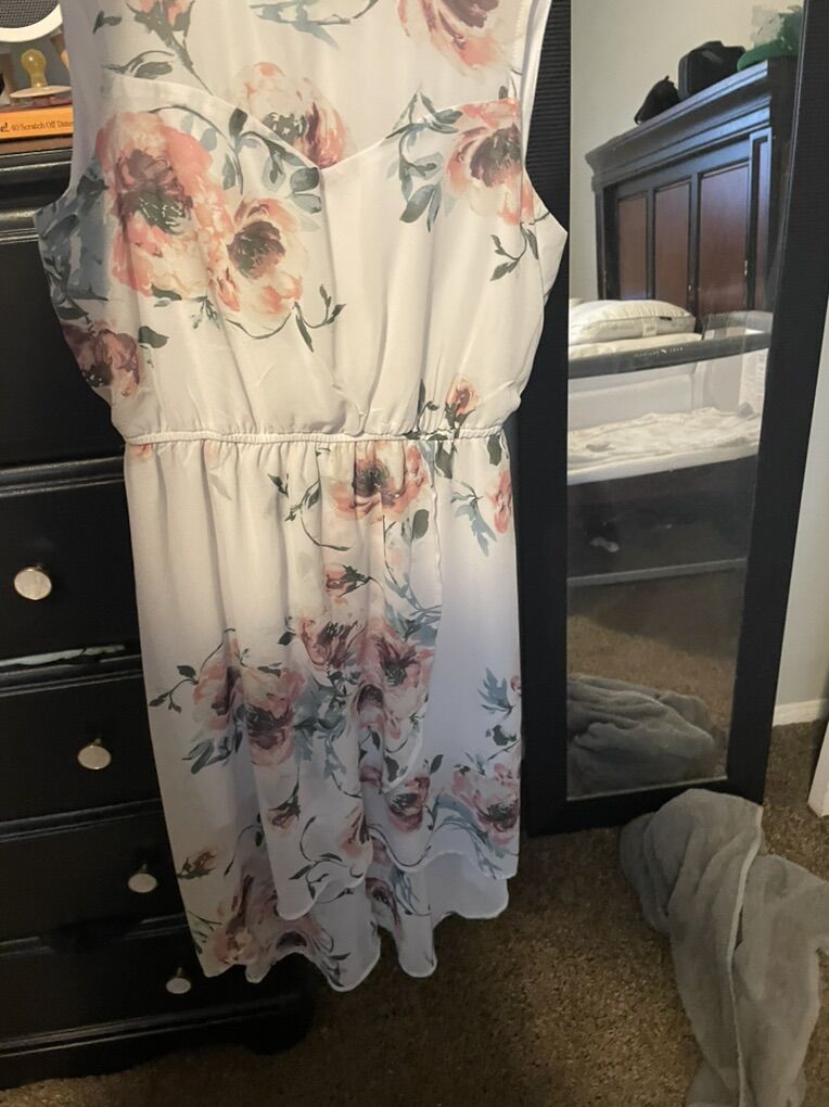 Size medium Been used only a couple times still in great condition but I don’t like how it looks on me. Is high low with lace at the top with a stretchy waste band