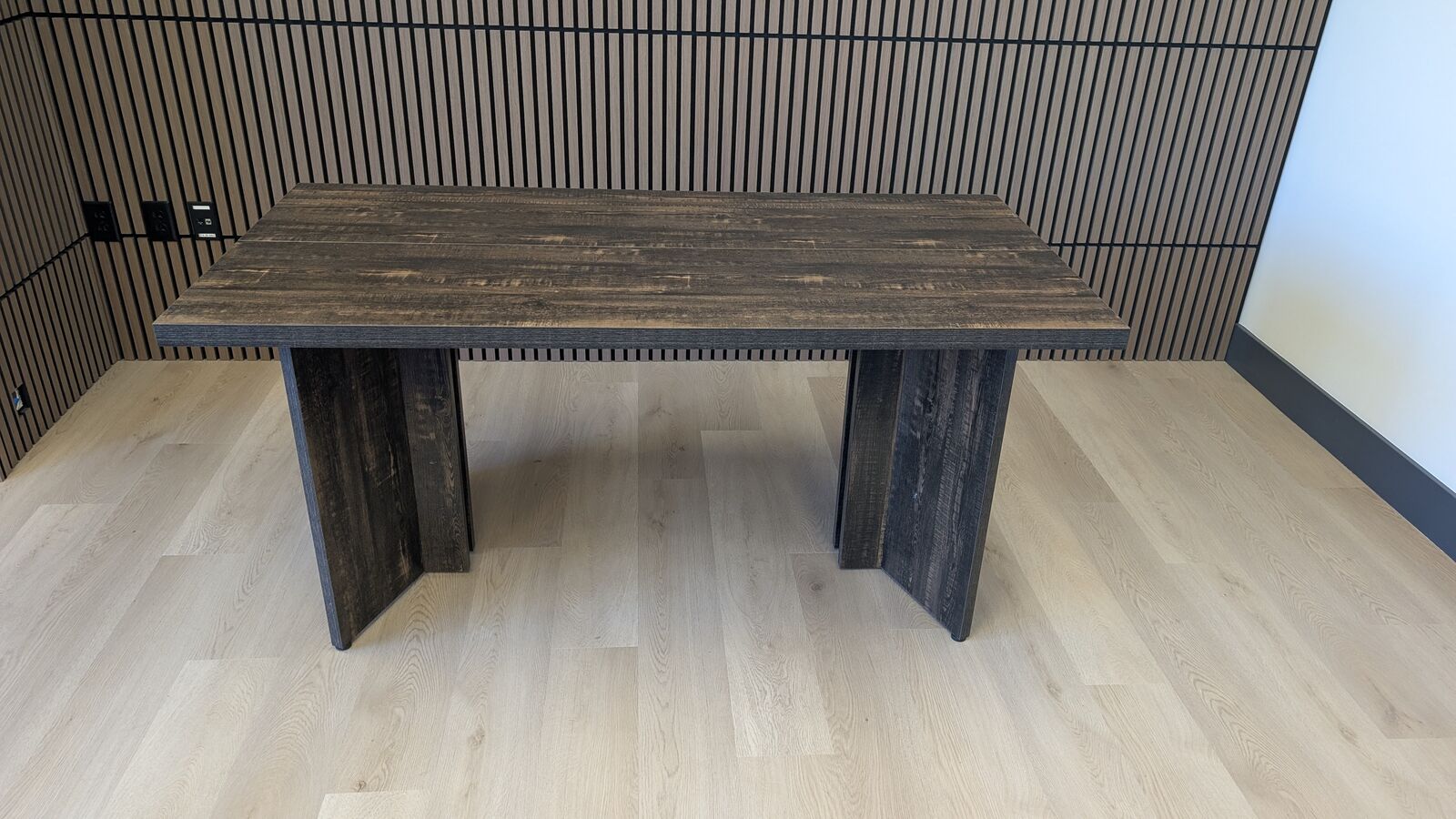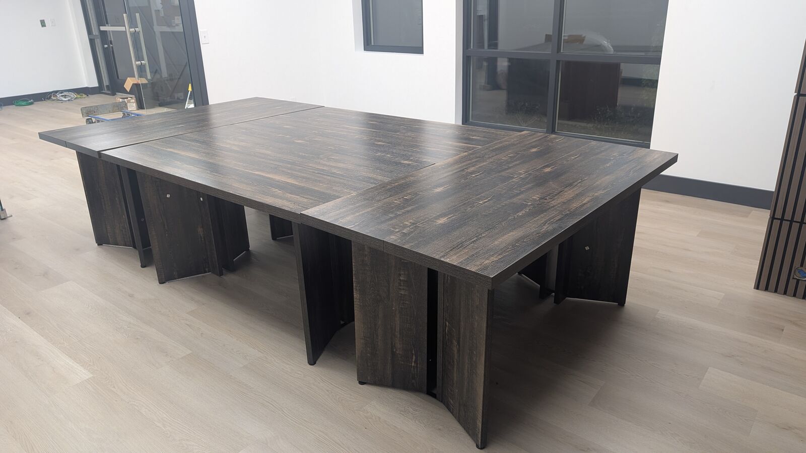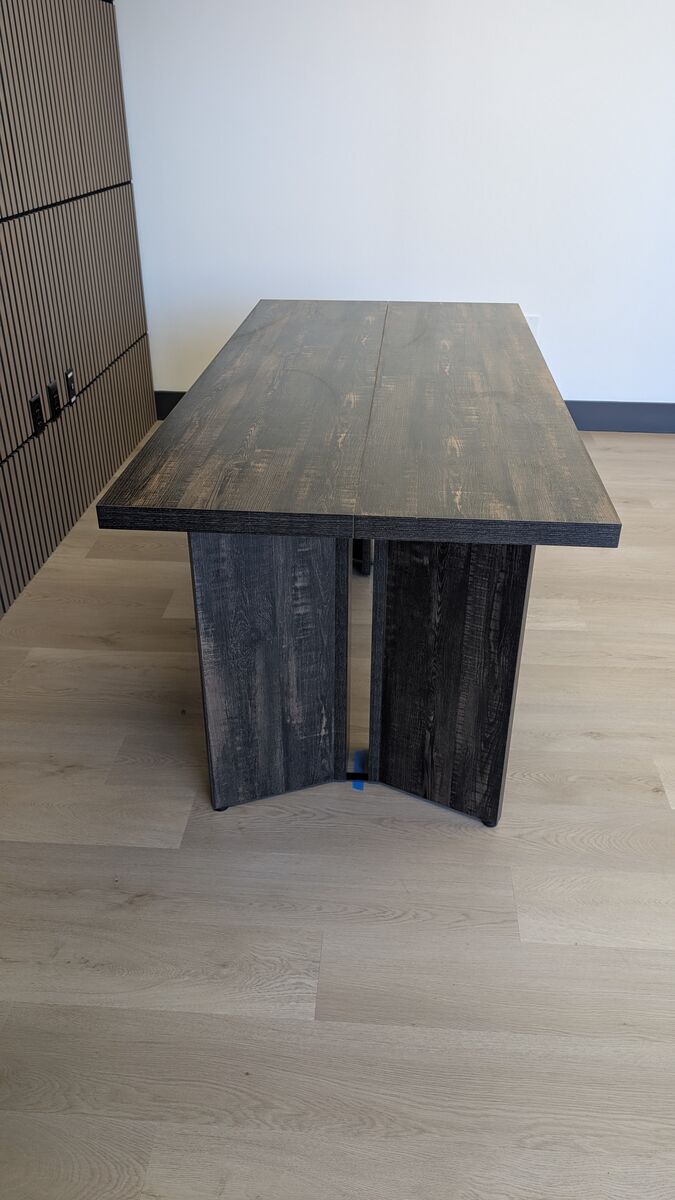 Add a touch of contemporary style to your dining area with this sleek, minimalist dining table. This table features a beautiful dark wood-grain finish and a unique pedestal-style base for a sophisticated look. 4 units available that can be put together as one large table or separated out as a small table or desk.