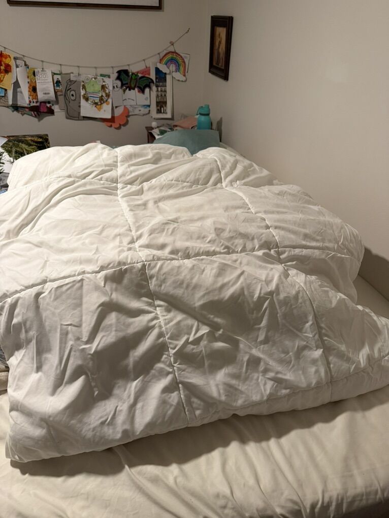 This is a white king sized comforter. Very warm and fluffy. Synthetic down