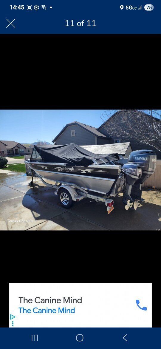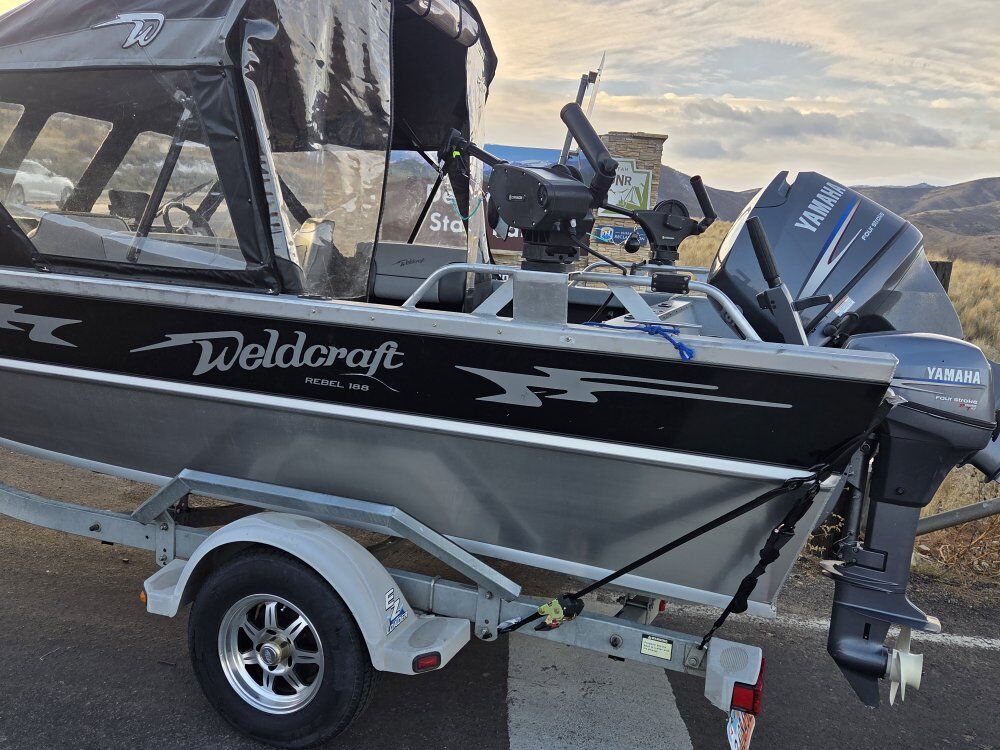Weldcraft Rebel 188 Fishing boat 2008. 20 ft length of boat. Ezloader trailer. Tongue folds to save space while parked. Trailer has breaking system. Spare tire. Yamaha 90 hp and 8 hp kicker. Will reach 32 mph. Motors are in great shape and the oil is clean. Steering rod connects steering between both motors for trolling. Both motors have power tilt. Cannon downriggers one is electric and new. . Bimimi cover with sides and back panels. New battery. New hummingbird Helix 7 fish finder. Great condition. Water tight no leaks. 42 gallon fuel tank. 4 stroke motors sip the gas. Seats 6 comfortably. Wash down pump and hose. Pole holders. Boat gets many compliments when out fishing. Looks great and functions very well. High quality construction aluminum boat. Will last for many years.