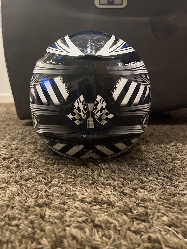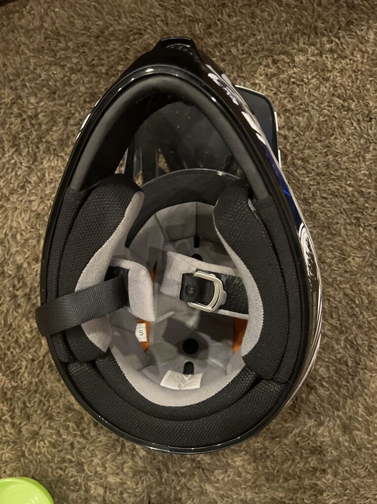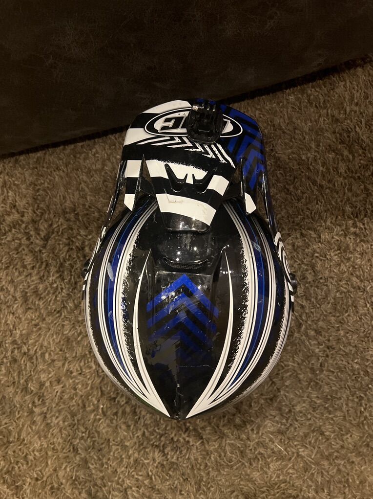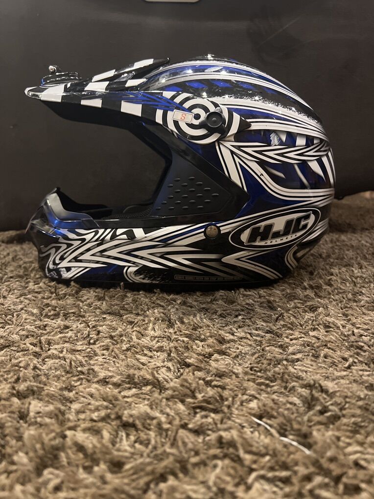 PayPalBlue HJC dirtbike helmet and bag. Extra visor screw. Has a few scratches, size small, and has a camera mount on the visor.