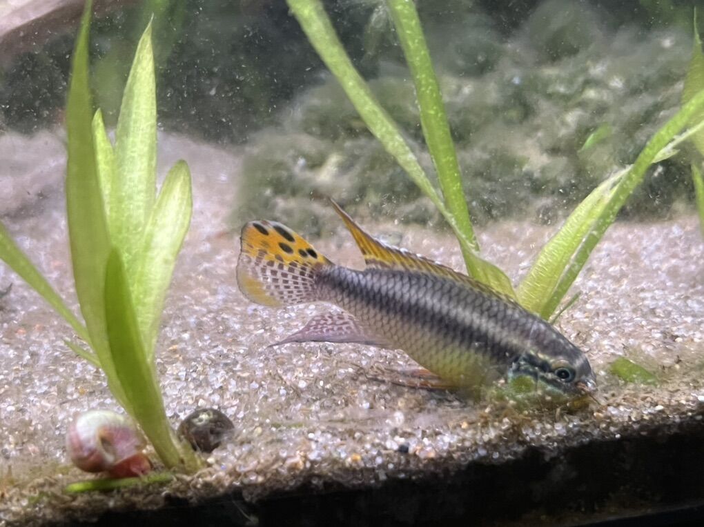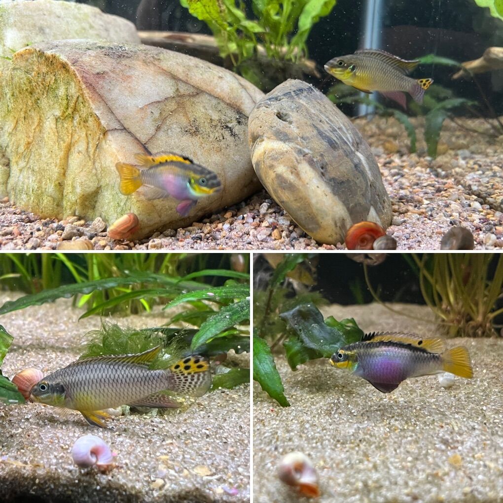 Locally bred F1 Pelvicachromis Kribensis “Moliwe” from wild-caught parents. Fish are beginning to show adult coloration, with males and females available and starting to form pairs.\