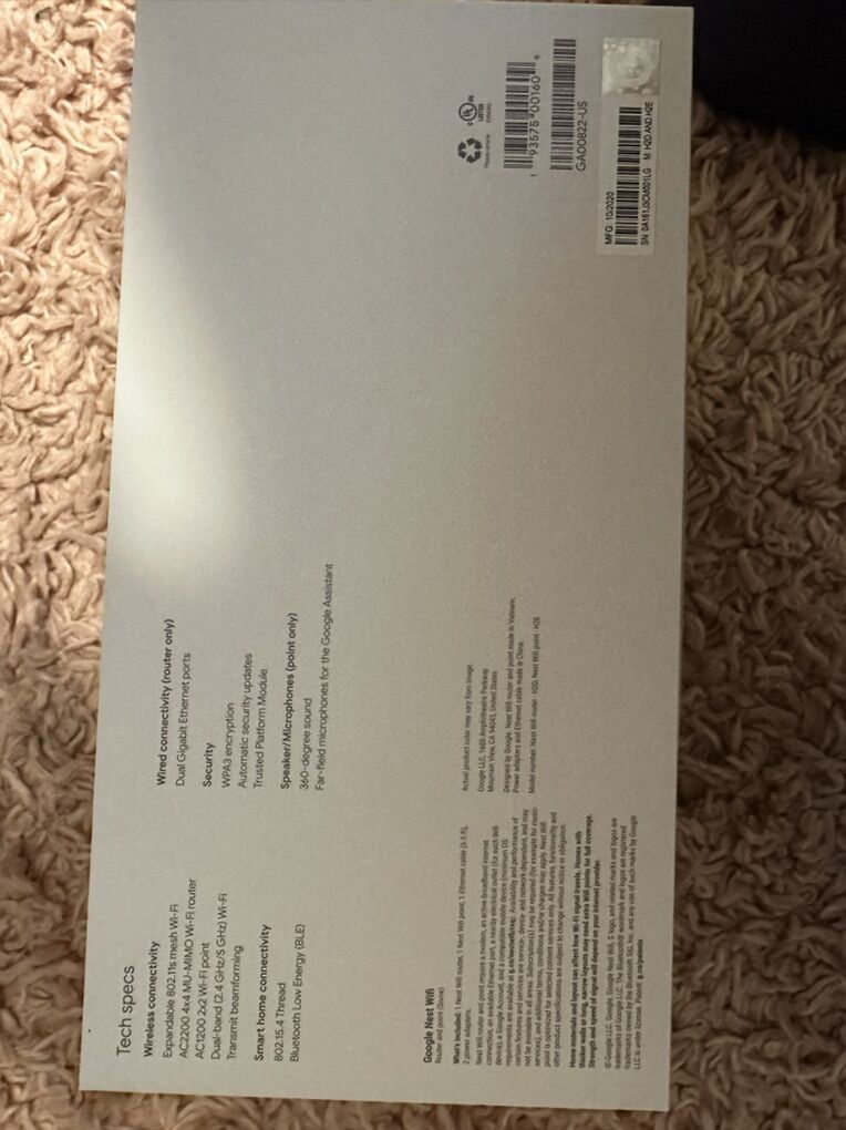 VenmoGoogle Nest WiFi - Router & Point (2-Pack) Condition: New in Box Key Features: ∙ AC2200 dual-band mesh WiFi system ∙ Coverage: Up to 3,800 sq ft ∙ Supports 200+ devices ∙ 4 Gigabit Ethernet ports (router) ∙ WPA3 security with automatic updates ∙ Google Assistant built into Point ∙ Easy setup via Google Home app ∙ Parental controls & guest network What’s Included: ∙ 1 Nest WiFi Router ∙ 1 Nest WiFi Point (with speaker) ∙ Original packaging & accessories Eliminates dead zones with seamless mesh coverage throughout your home.