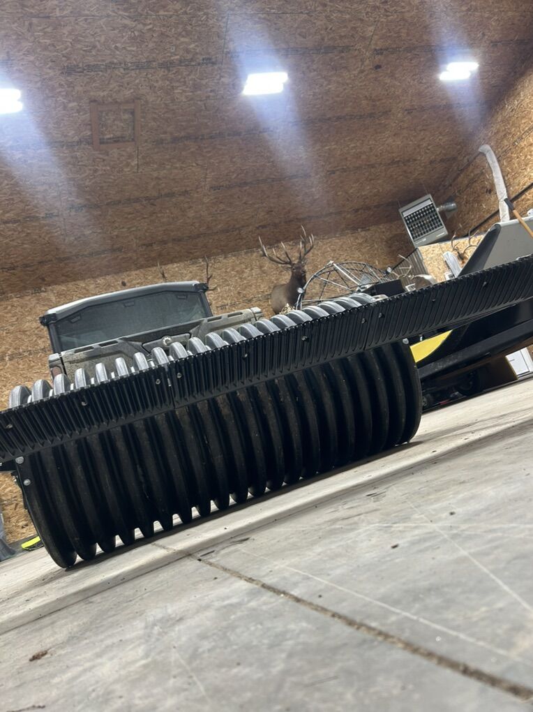 Has grooming comb on the back that you can drop or leave up and just roll. Has a 2 inch ball hitch. Pull it behind my can am on tracks. Has a place to add more weight in the front as well.