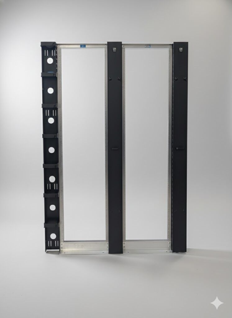 This heavy-duty CPI (Chatsworth Products, Inc.) dual-post open frame server rack is an ideal solution for organizing networking equipment, servers, and high-density cabling in data centers or a home office. It features a robust aluminum and steel construction, designed for stability and easy access.