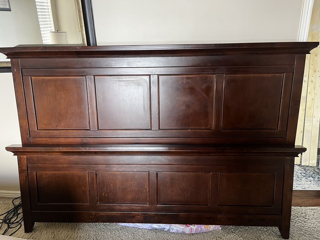 ApplePayDark wood king sized headboard, footboard, and rails for sale. $250 obo. Headboard: 54” tall Footboard: 27” tall Both 82” wide Rails and mattress supports