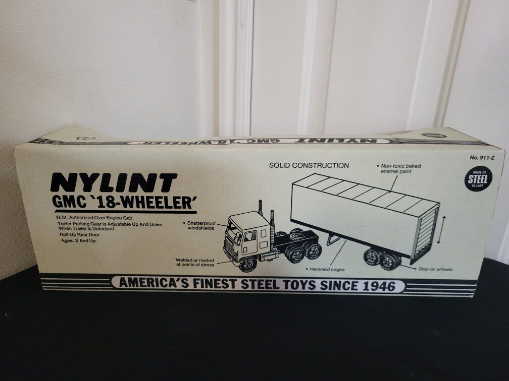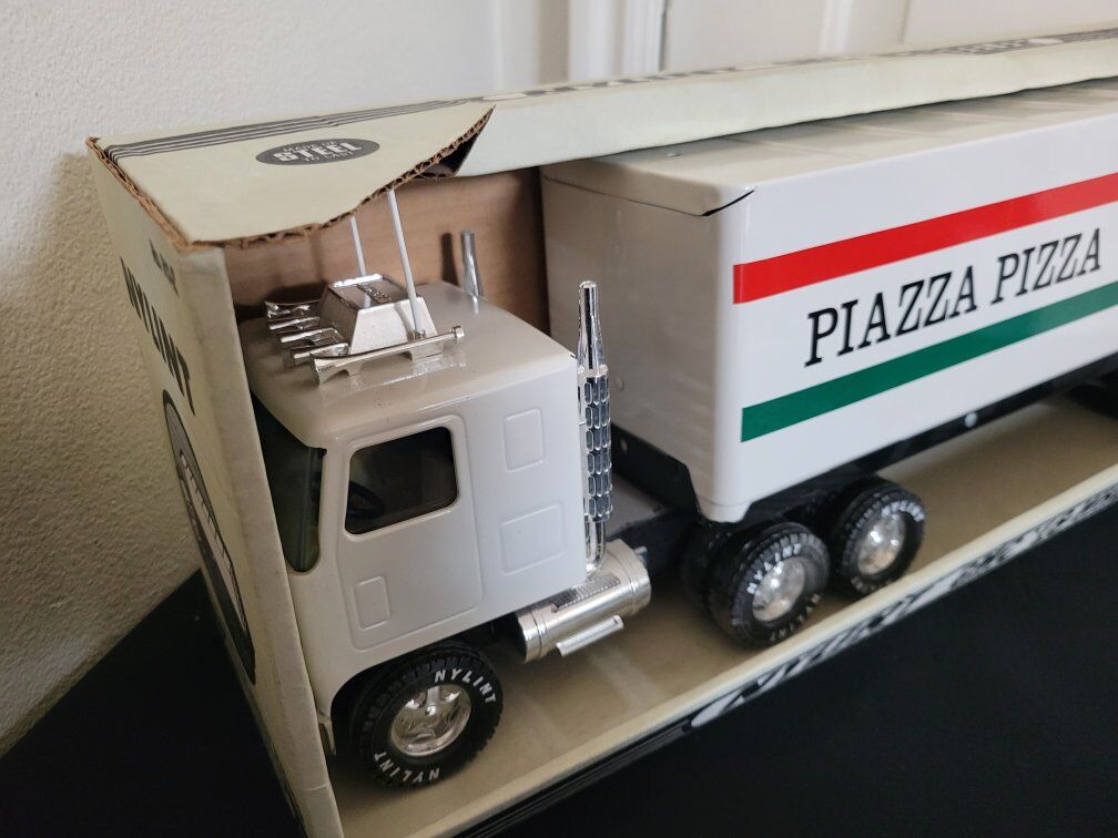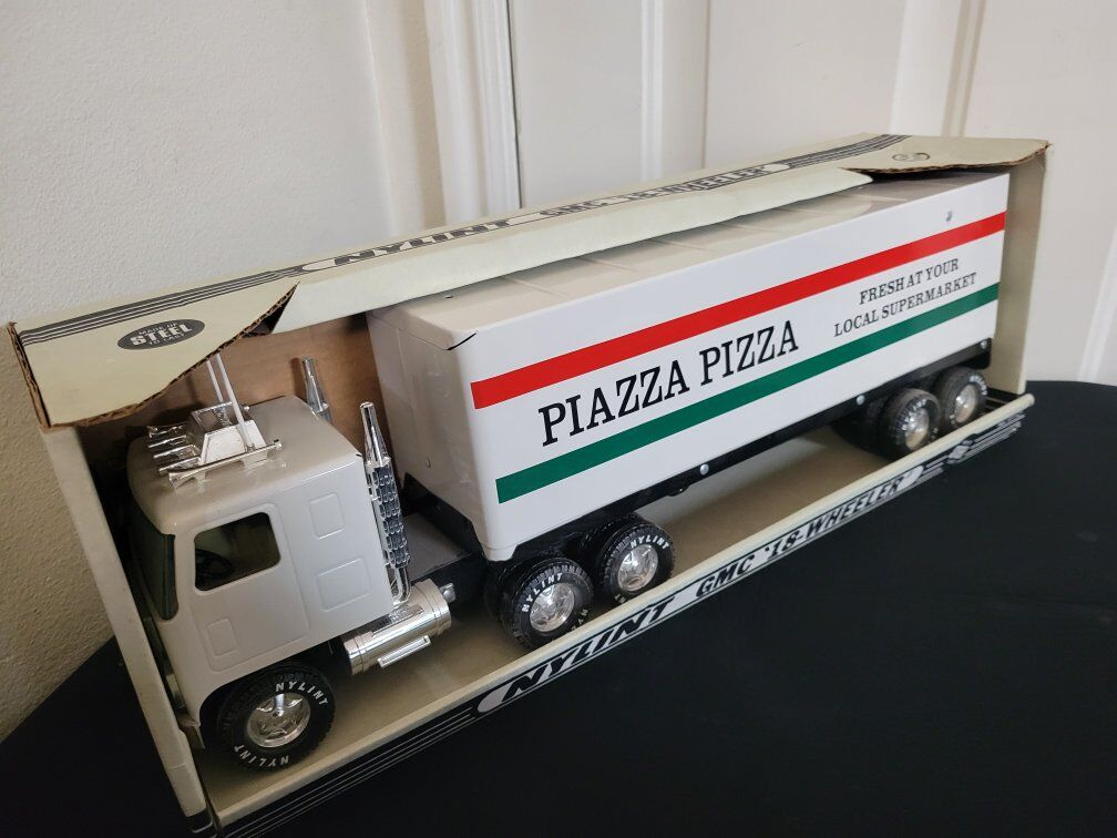 vintage Nylint GMC 18-Wheeler toy semi-truck with a "Piazza Pizza" branded trailer.It is a collectible item. Manufacturer:Nylint, a company known for producing pressed steel toy vehicles. Material:The cab is made of plastic and pressed steel, while the trailer is entirely pressed steel. Branding:The trailer features "Piazza Pizza" branding with the text "FRESH AT YOUR LOCAL SUPERMARKET". Scale:These trucks are typically in a 1:18 scale. Collectibility:Promotional trucks like this were often produced in limited runs and are considered highly collectible