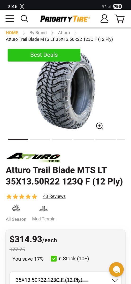 Tire Atturo Trail Blade MTS LT 35X13.50R22 123Q F (12 Ply) new asking $149 retail $314