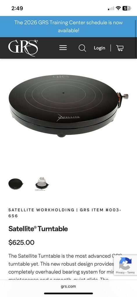Satellite® Turntable Retails: $625.00+tax The Satellite Turntable is the most advanced GRS turntable yet. This new robust design provides a completely overhauled bearing system for minimum maintenance and a smooth, quiet glide. The turntable’s sealed profile promotes a cleaner internal environment and limits contamination from metal chips. The top of the turntable has been marked with easy centering lines to accommodate any GRS vise. Includes Brake Kit (#003-343) and Low-Friction PTFE Pad (#044‑165). Does not include vise, Satellite Stand, or Centering Post. Pick up in Taylorsville