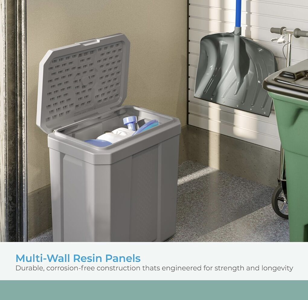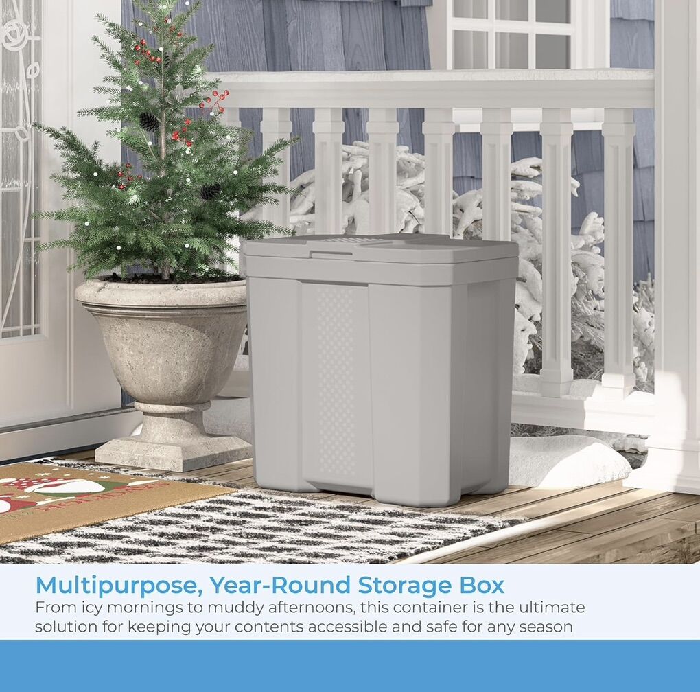Suncast 28 Gallon Heavy Duty Storage Box, Durable, Multi-Purpose Container for Salt, Sand, Dirt, Ice Melt, and Outdoor Supplies, Made in the USA, Made in the USA