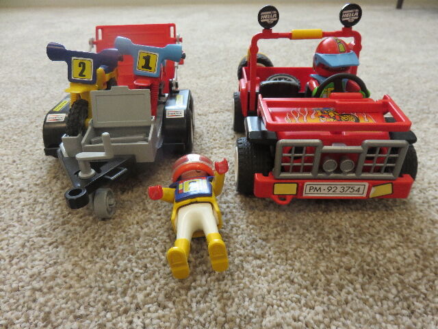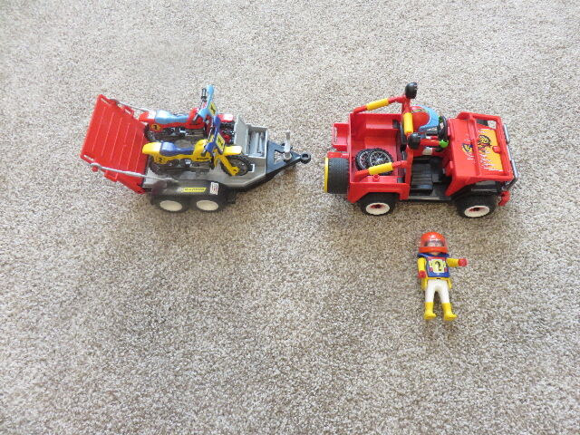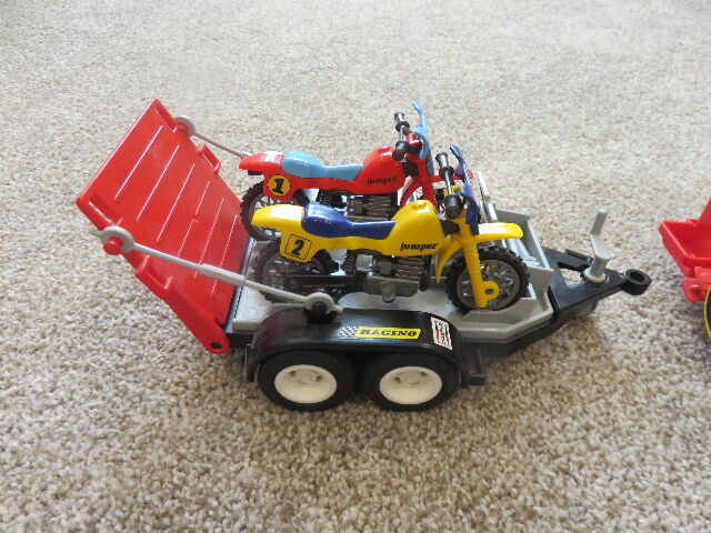 As the pictures show, this mid-1990's Playskool set that includes the Red Jeep and Dirt Bike Trailer; with the two included dirt bikes, figures and accessories (tools, extra tires, etc.), is in like new condition.