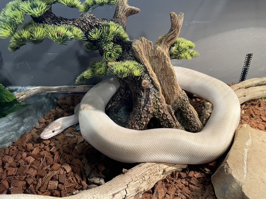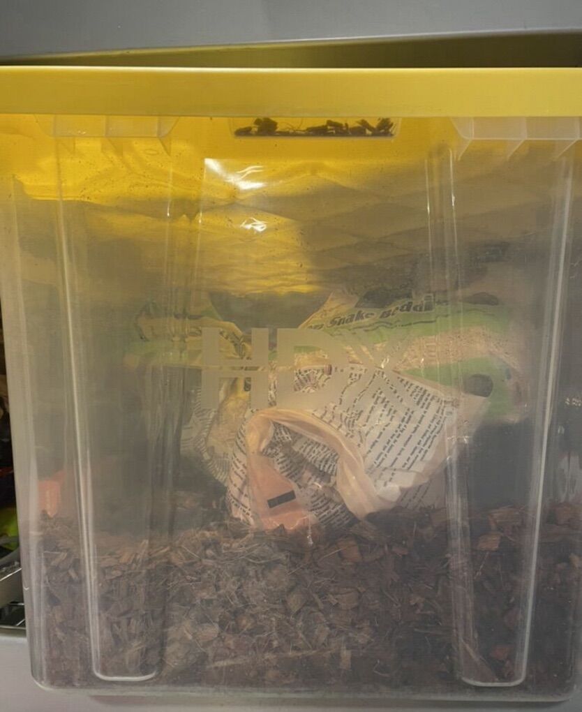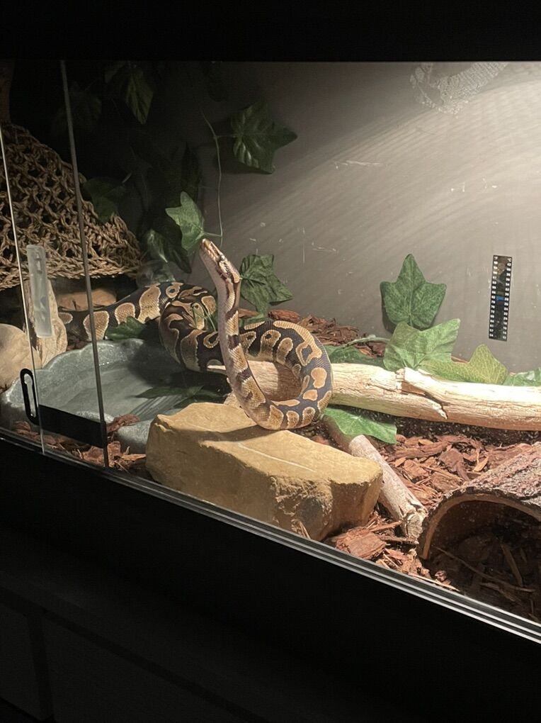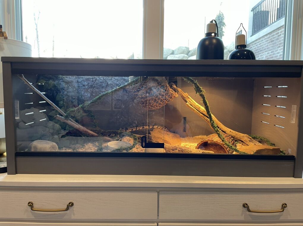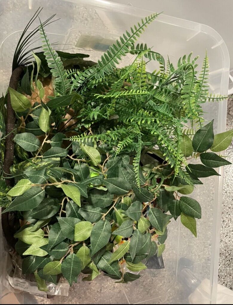 INCLUDED: 50 gallon lightweight tank with front opening doors that’s been customized so a heating mat can be installed inside easily, LED lights along the top of tank as well 15 gallon tank used for feeding or temporary holding during cage cleaning A waterfall water filter that’s brand new i never had the space to use it before A storage bin full of bedding with reptibark, regular bedding, and orange calcium sand A handful of different leaves and vines in different colors and patterns A large black hide A large bonsai tree hide A large corner moss hide A large rock hide Large log and rocks used for decor or climbing Two large water bowls Feeding tongs A 170 watt basking lamp Ceramic heating lamp for night heating