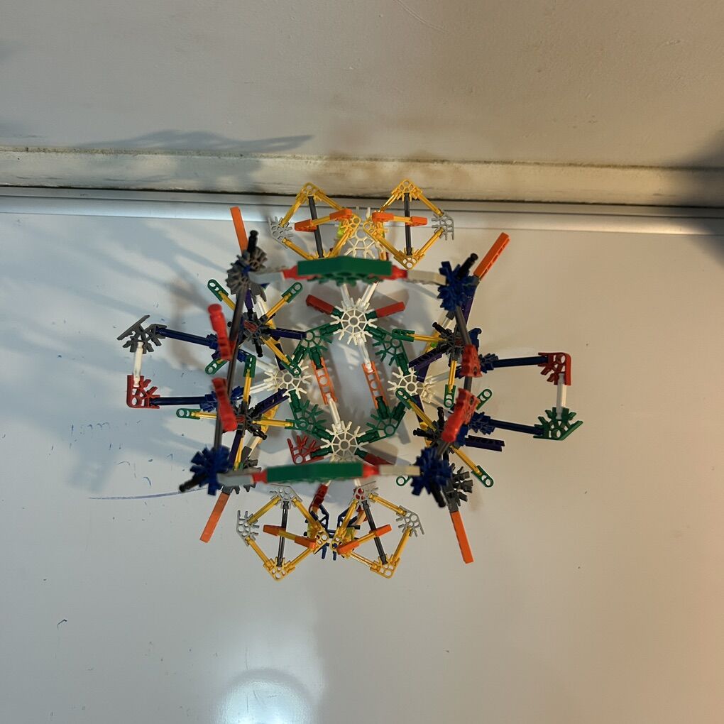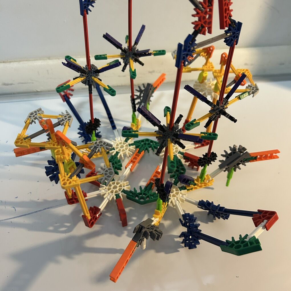 Photo is of a random structure I made using as many pieces as possible by just connecting pieces, without any thought ahead of time. Sometimes I’d have to undo something when I wanted to go in a different direction but that’s half the fun. Simply connect and go. Very helpful for dealing with anxiety and stress,. No pattern, just exploring the pieces and how they fit together. Delivery available to a convenient location when in your area for $5.