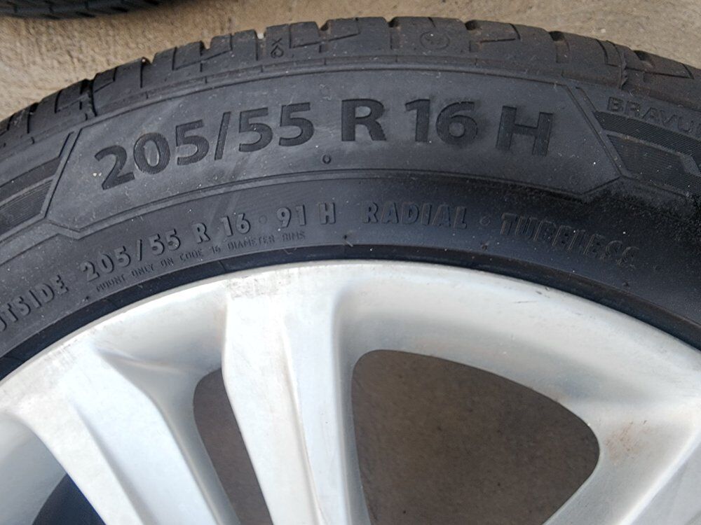 3 bravuris barum tires mounted on hyundai rims (6.5x16") with tpms. 205/55/16 tire size We got into an accident a few weeks after buying these tires (1 rim and tire were damaged in the accident) Tires in excellent condition. Rims are in good condition.