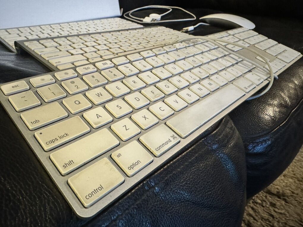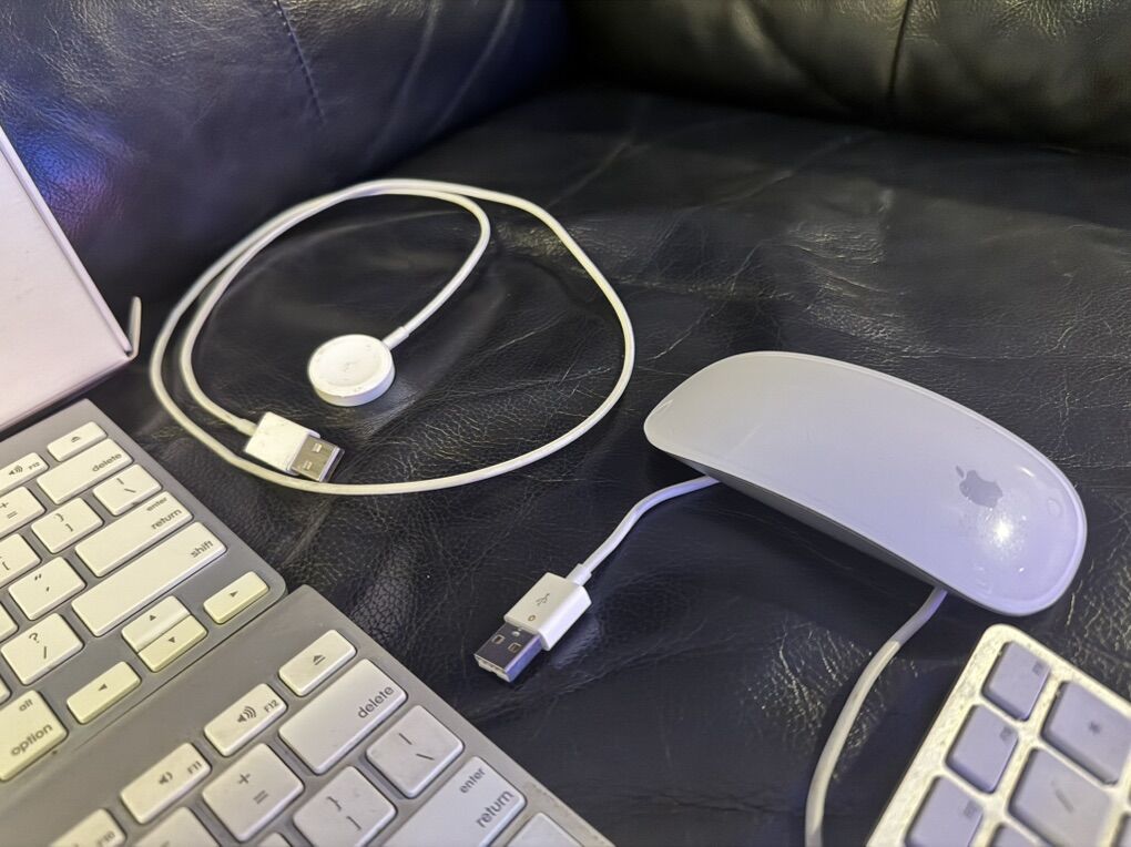 Includes 1 AA battery powered Bluetooth mouse, 1 mag iWatch charger, 2 wireless Bluetooth keyboards and 1 USB full-size keyboards. The largest wired keyboard functions except for three numeric keys on right side. Message me with any questions.