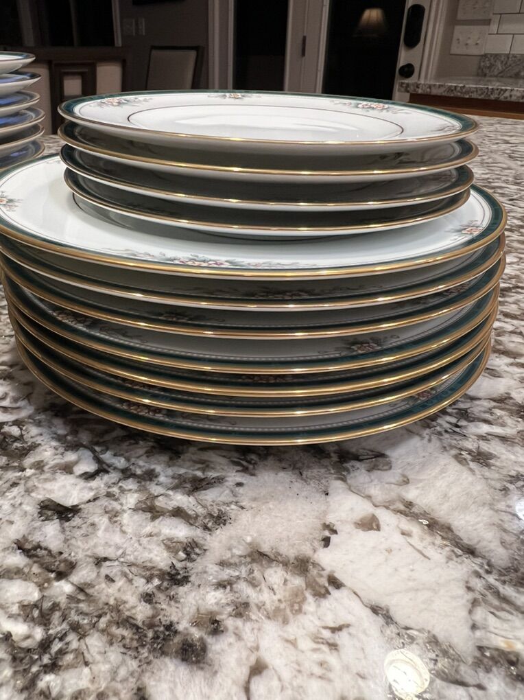 Venmo8 dinner plates, 7 lunch plates, 4 dessert plates and 8 bowls. I believe this style is called Landon. It’s a beautiful green color. All pieces are in pristine condition, they still look brand new.