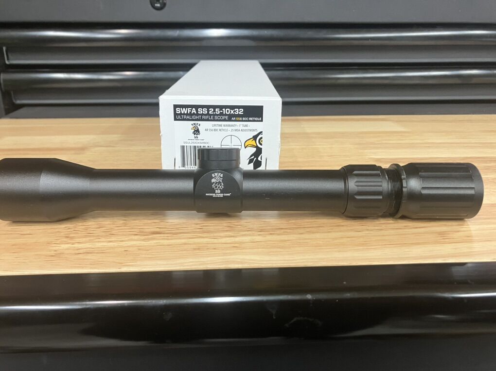 SWFA ultralight rifle scope 2.5 - 10 x 32, has BDC reticle. To my knowledge this is the lightest hunting rifle scope you can buy. Weights 9.5oz. Very nice scope in new condition. Mounted it sighted in the rifle, then sold the rifle it was on. Comes with original box.
