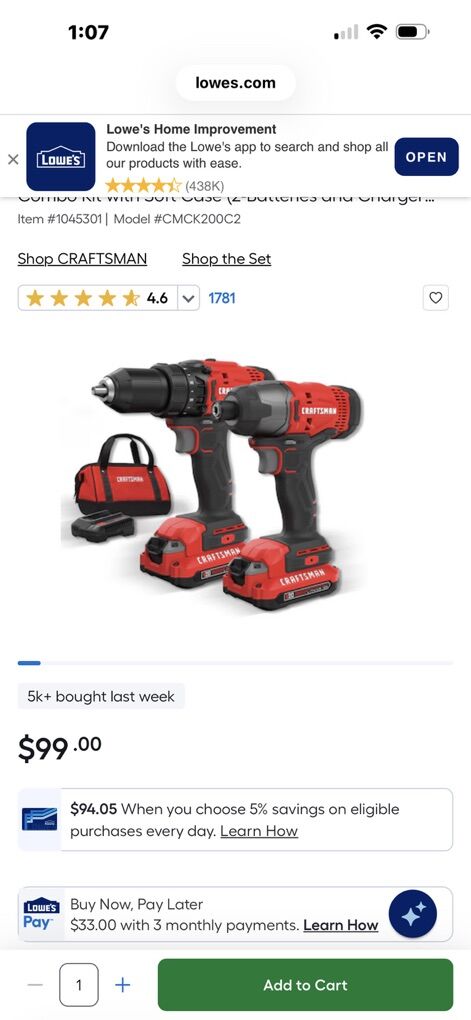 This is a nice craftsman drill and impact set w/2 batteries and charger. Comes just as shown! This exact set is 99.99 At lowes right now! as shown in photos, don’t pay retail prices, call Dustin instead now at 801-205-3404, I need it gone!