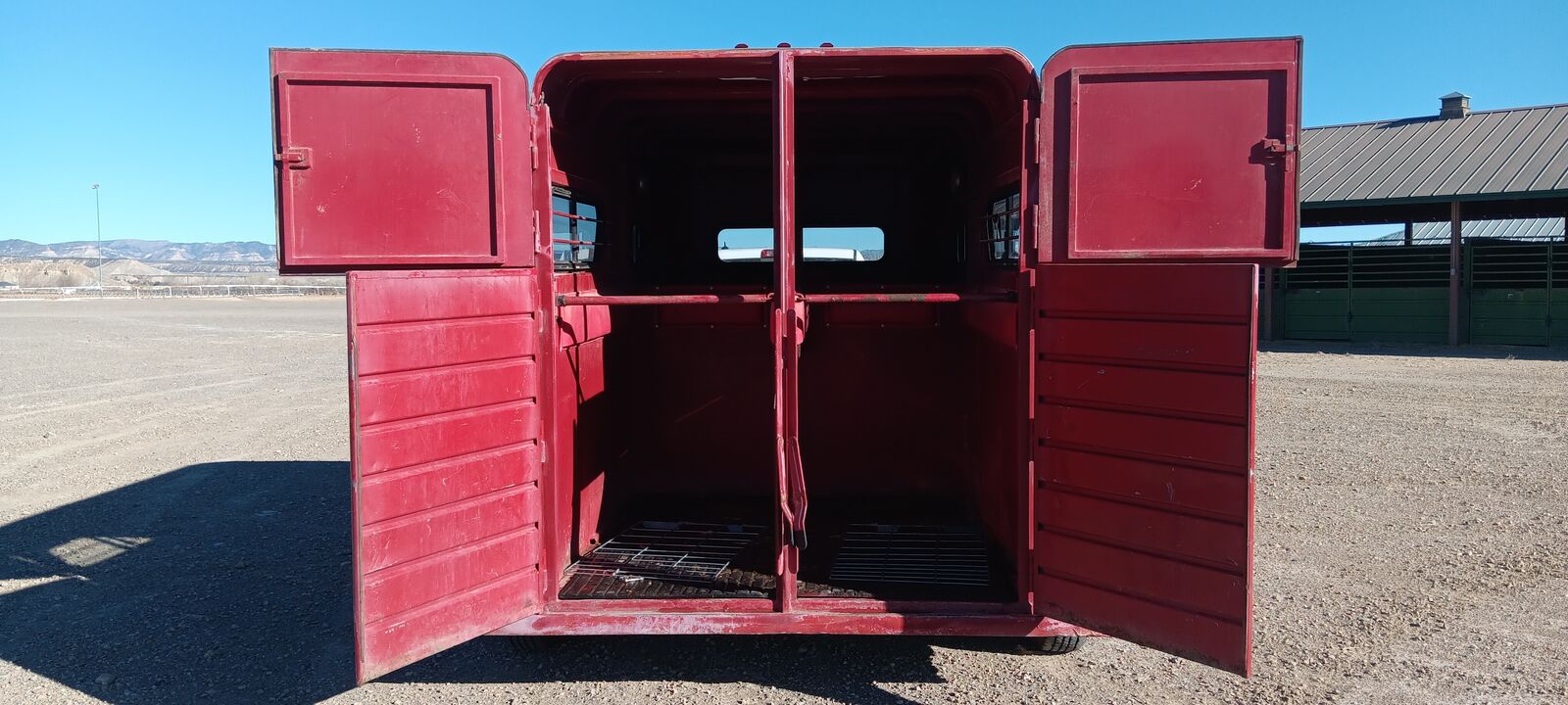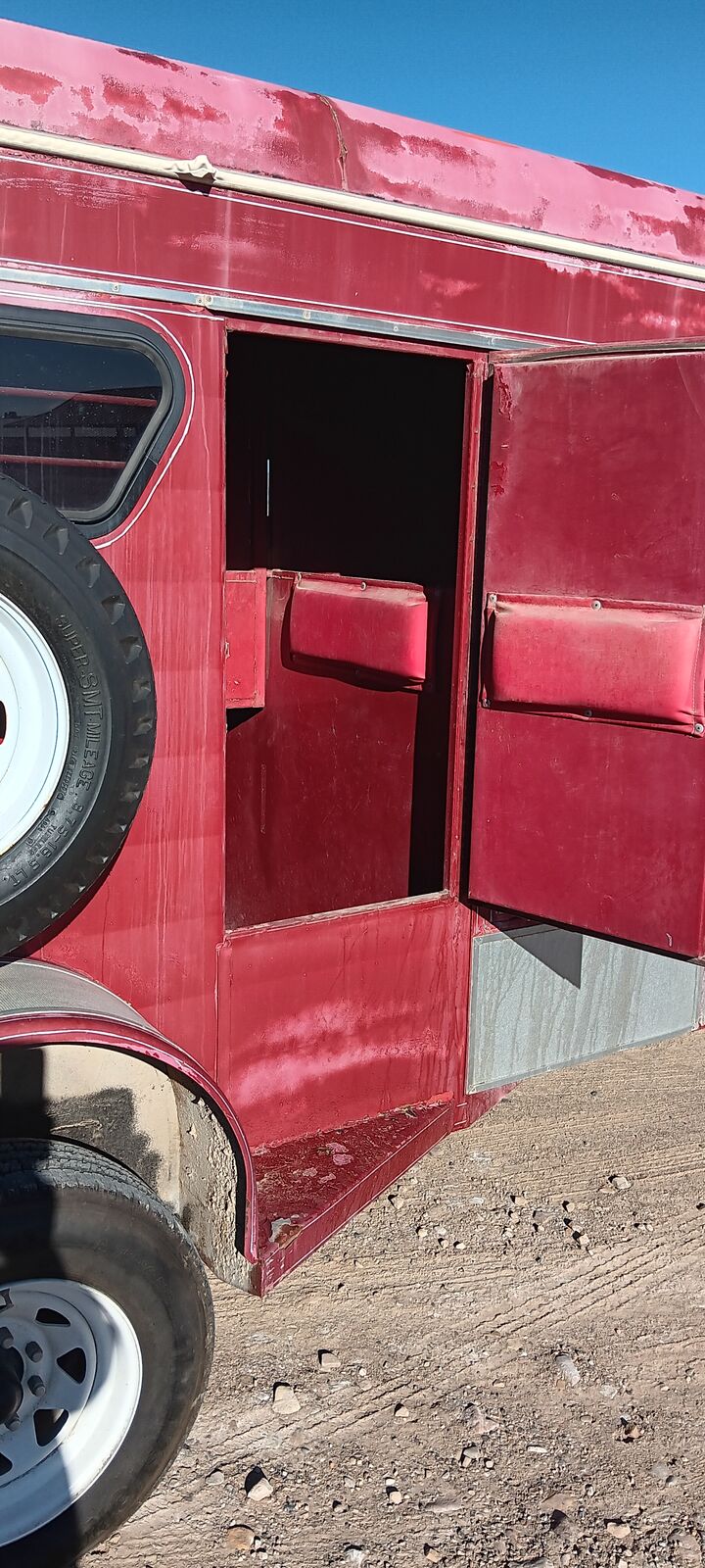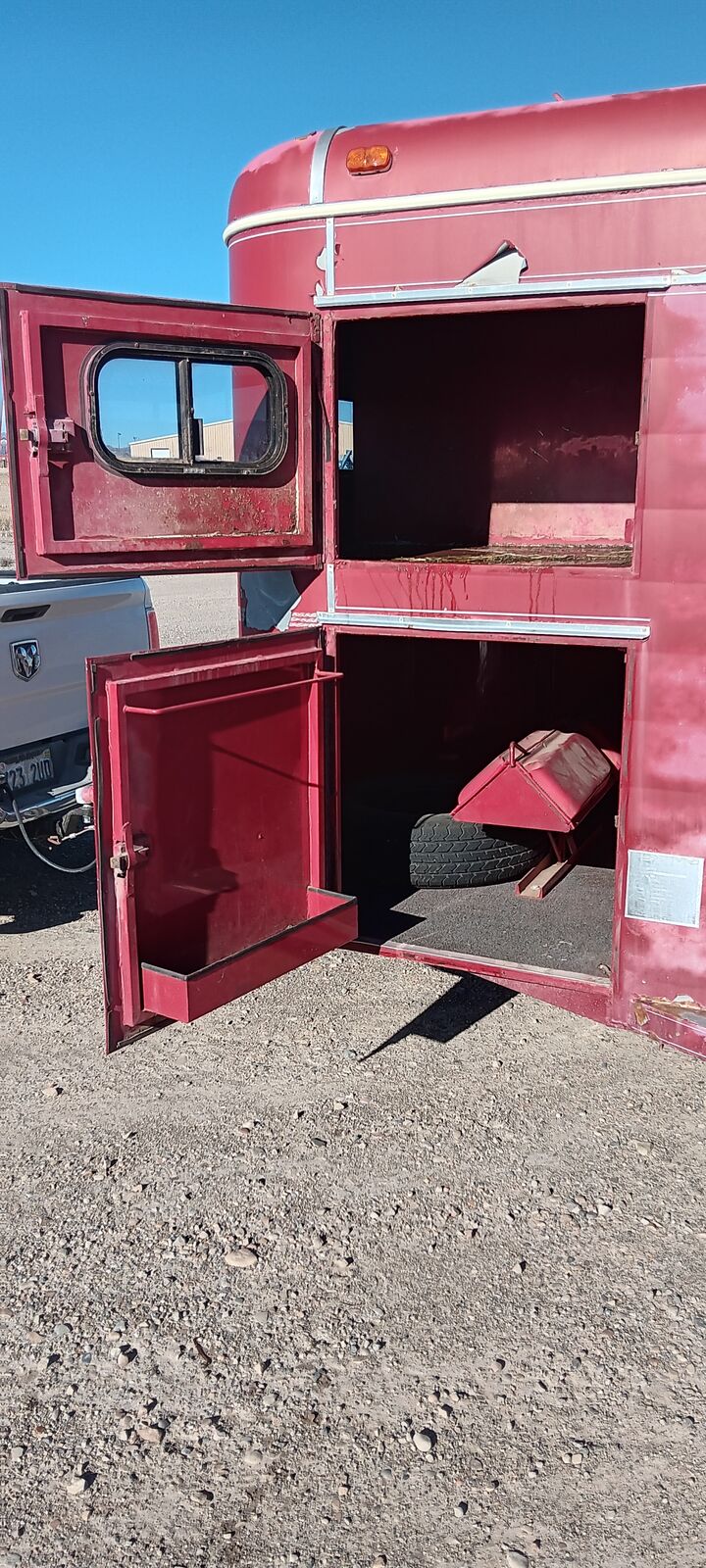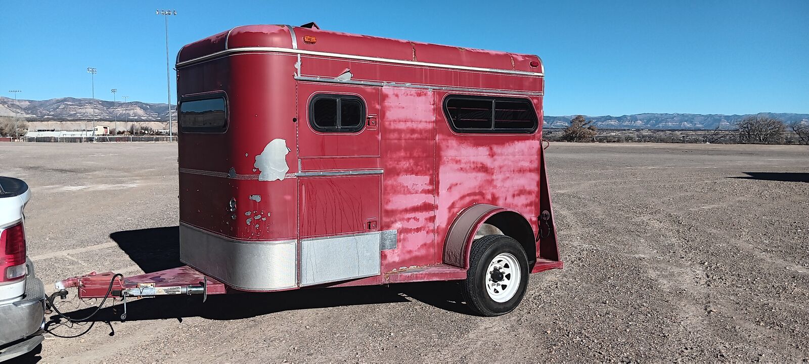 1990 Charmac two horse trailer, solid rear upper doors or screens. Slide out saddle rack both sides, side door entry, bull dog hitch 2” ball, led lights, interior lights, break away brake battery, new tires and repacked wheel bearings. Floor in great condition. Does need new paint, bad 1990’s acid rain primer? Metal under peeling paint excellent. Trade on 7x14 dump trailer?