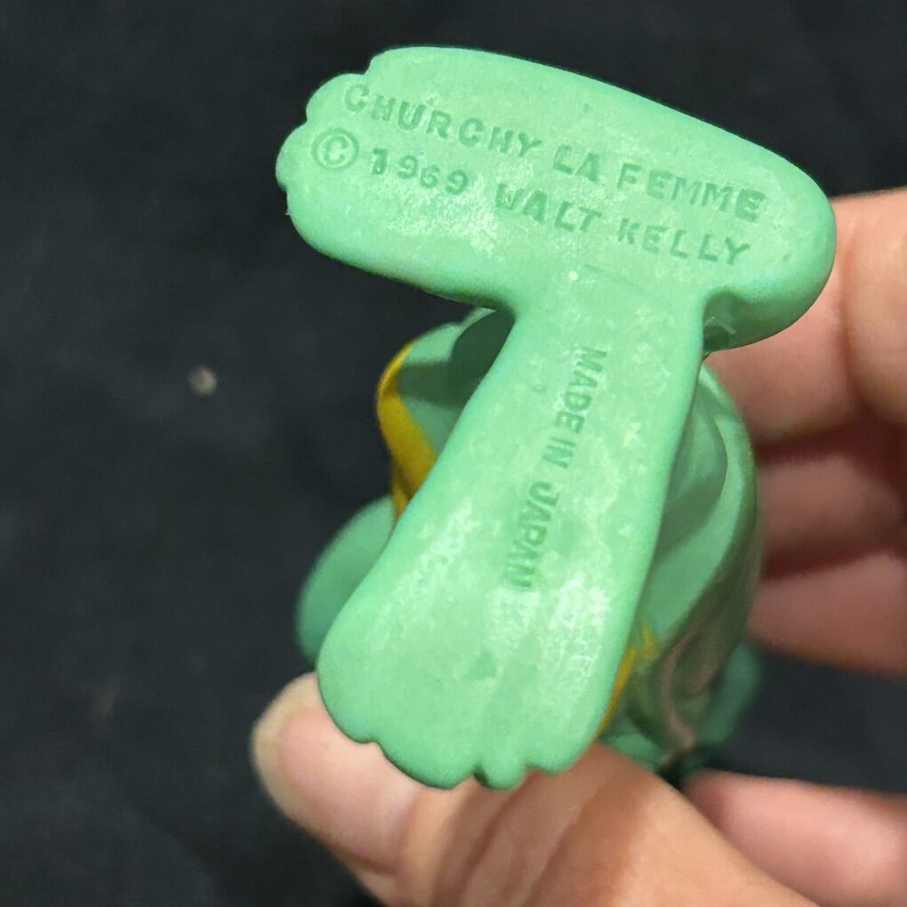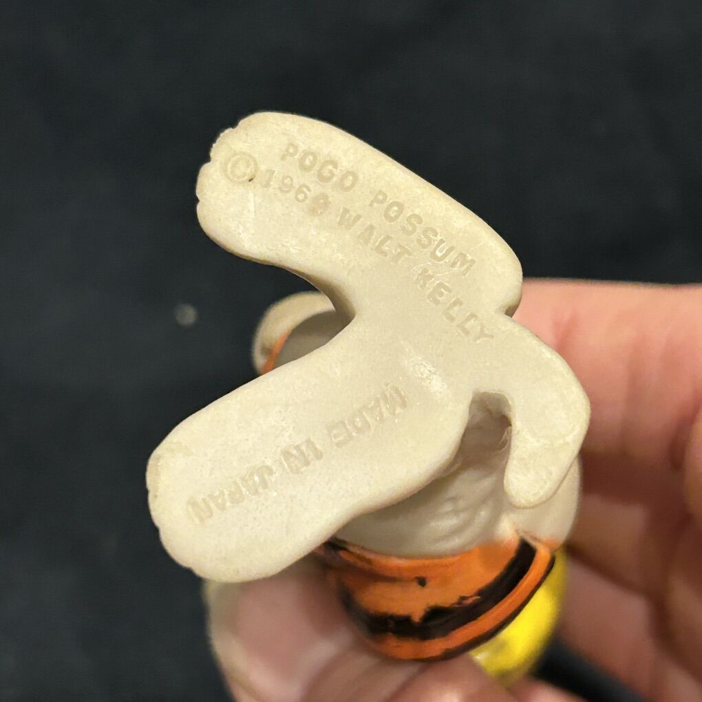 Churchy La Femme has movable arms and head. Pogo Possum has a movable head. The toys were made in Japan and are in good condition with no chips, cracks but do have wear on the paint consistent with their age.
