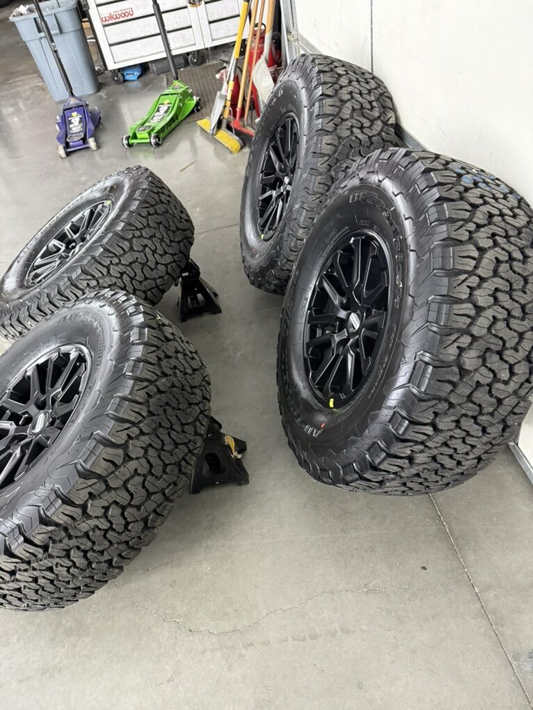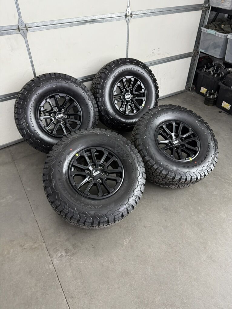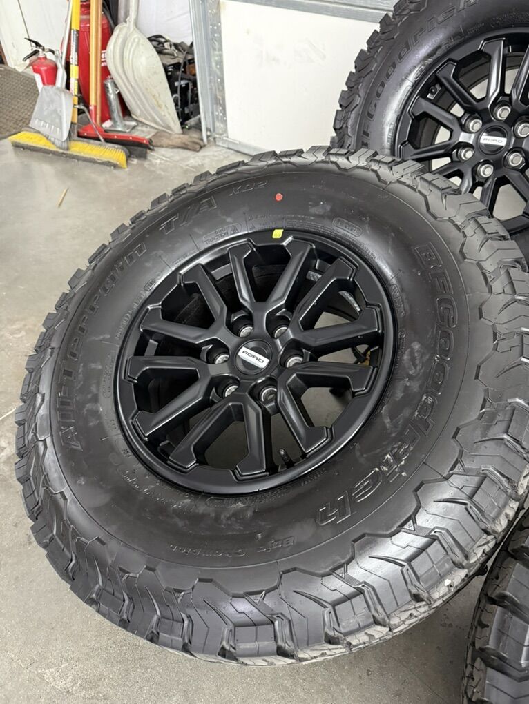 Wheels are 17in OEM wheels off a 2026 ford raptor truck. Very nice set of raptor takeoffs, satin black finish, amazing looking wheels. All of the wheels are in perfect shape, no curb rash, dings or major damage on them, wheels are in like new shape and look as if they just rolled off the assembly line. All of the center caps as well as lug nuts are included. Tires are 315/70/17 BFGoodrich KO2, load range C, one of the best tires on the market, no patches or plugs in them, tires have 5 miles so they are legit brand new.