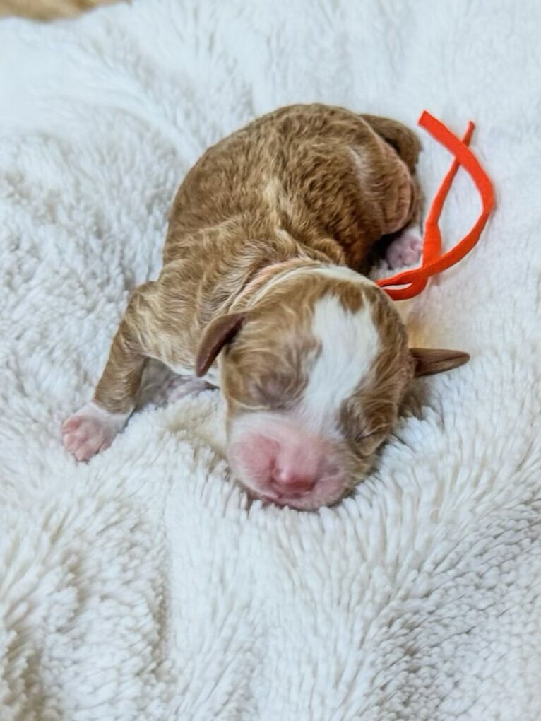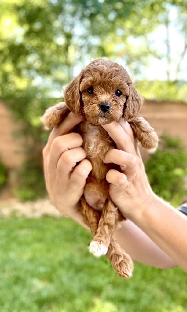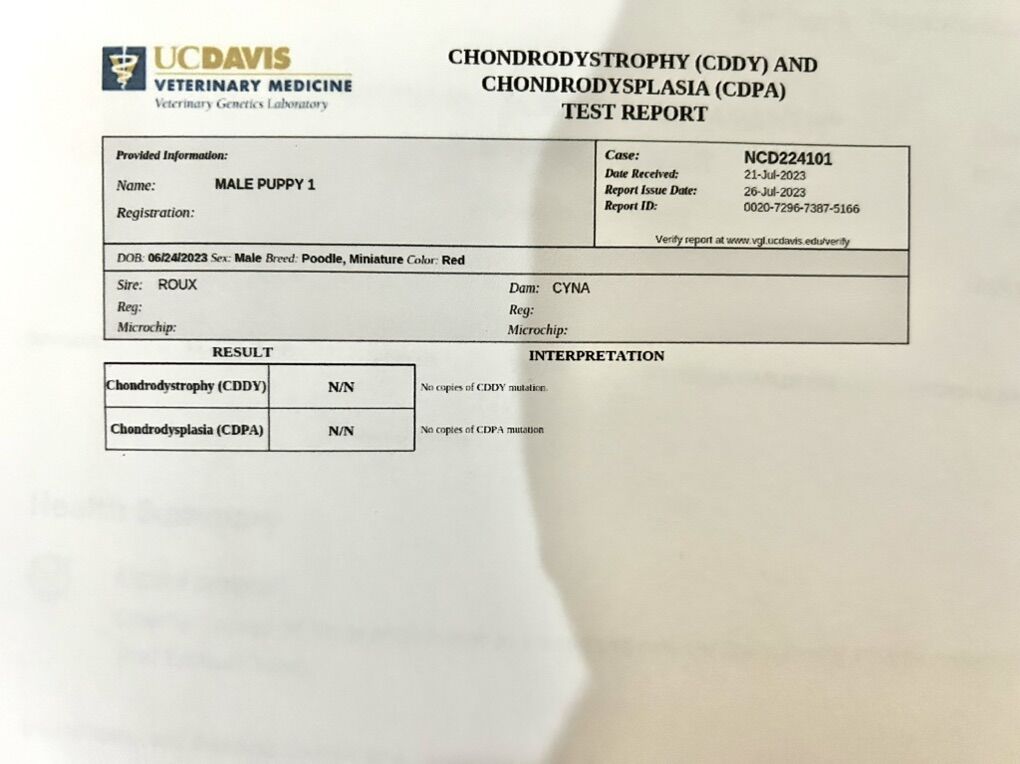 *Embark DNA 100% clear *Clear of CDPA and CDDY through UC Davis *OFA testing done on his Hips, Eyes, Heart, Patellas, Elbows *Coat: ee, kbky, ayat, BB, SS, FF no merle, no sable *Weighing: 9 lbs, 14 inches tall *Red, curly, non-shedding coat *Adorable teddy bear face with bright eyes.