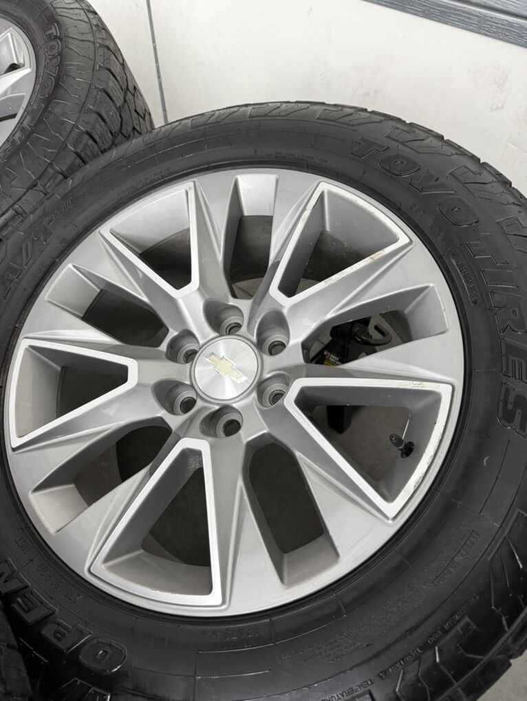 Wheels are 20in OEM wheels off a 2022 Chevy high country pickup truck. Wheels are in great shape, no curb rash or major damage, some light average wear, but overall they are in great shape, all of the center caps as well as the TPMS sensors, and lug nuts are included. Tires are 275/60/20 Toyo open country at3, top of the line tires, no patches or plugs, tires have great tread life left.