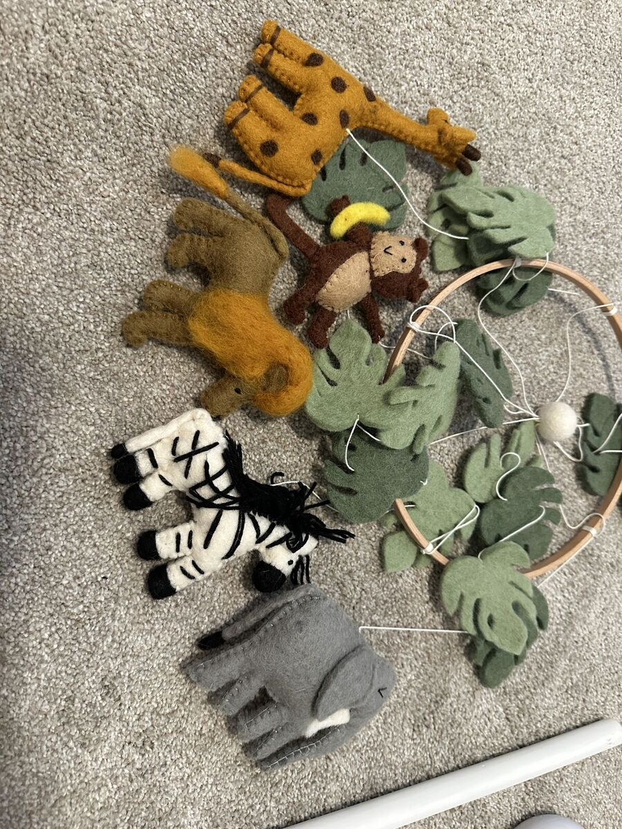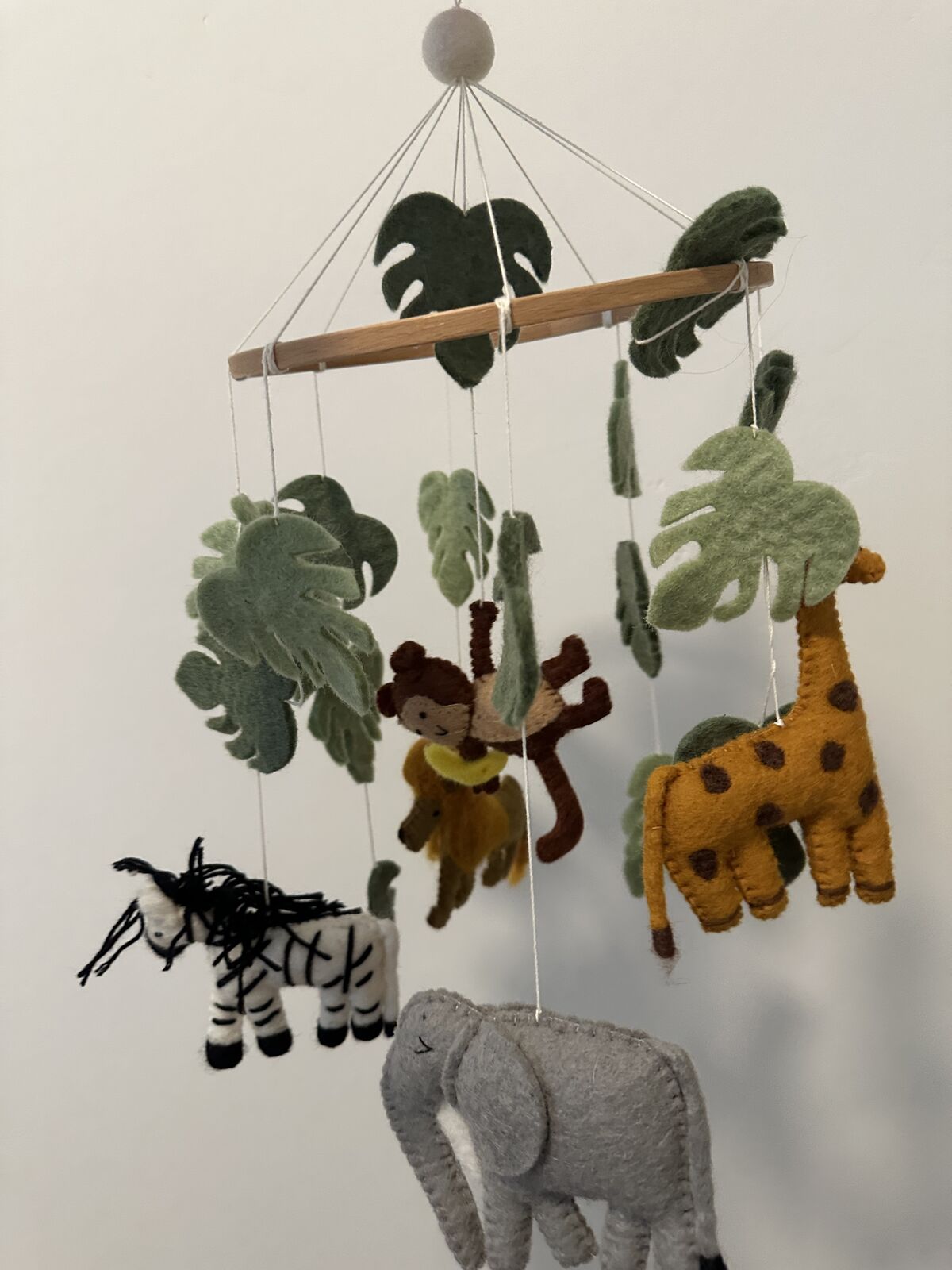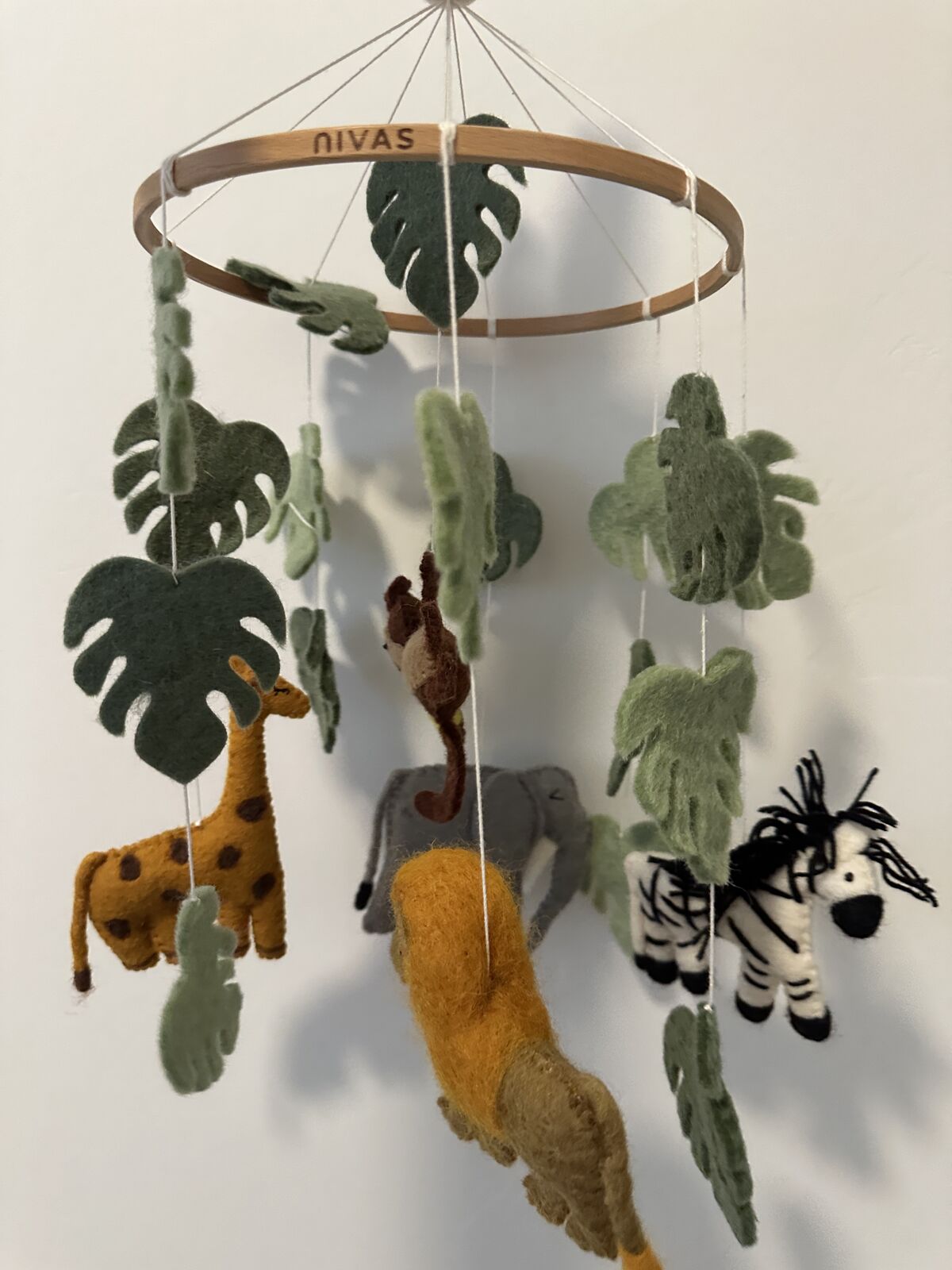 VenmoAdorable safari themed mobile! Comes with the hook and wall attachment! The hook plays songs while spinning the mobile.
