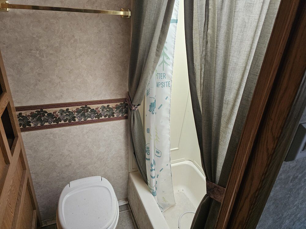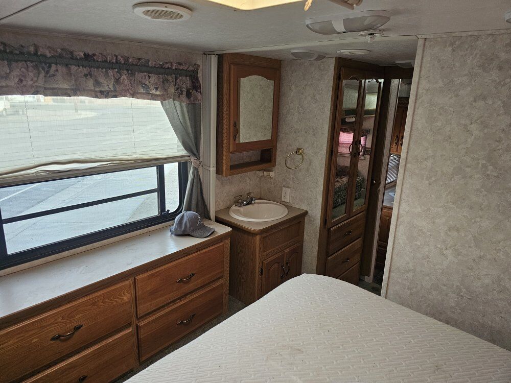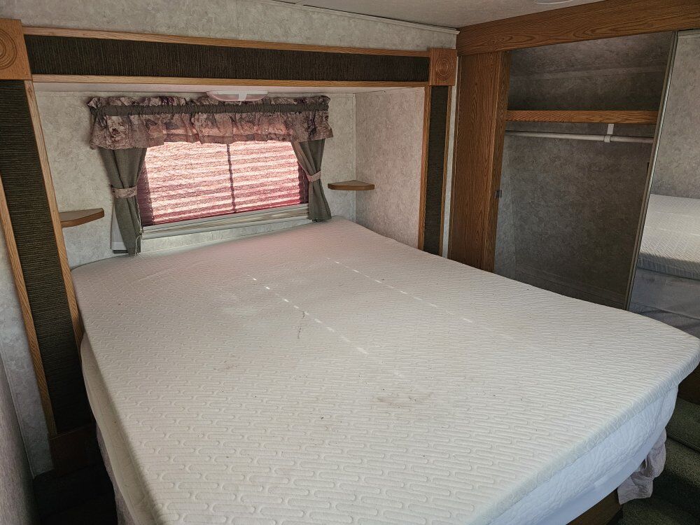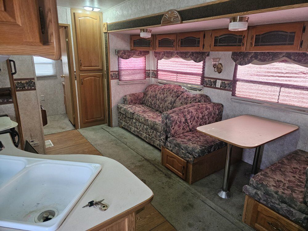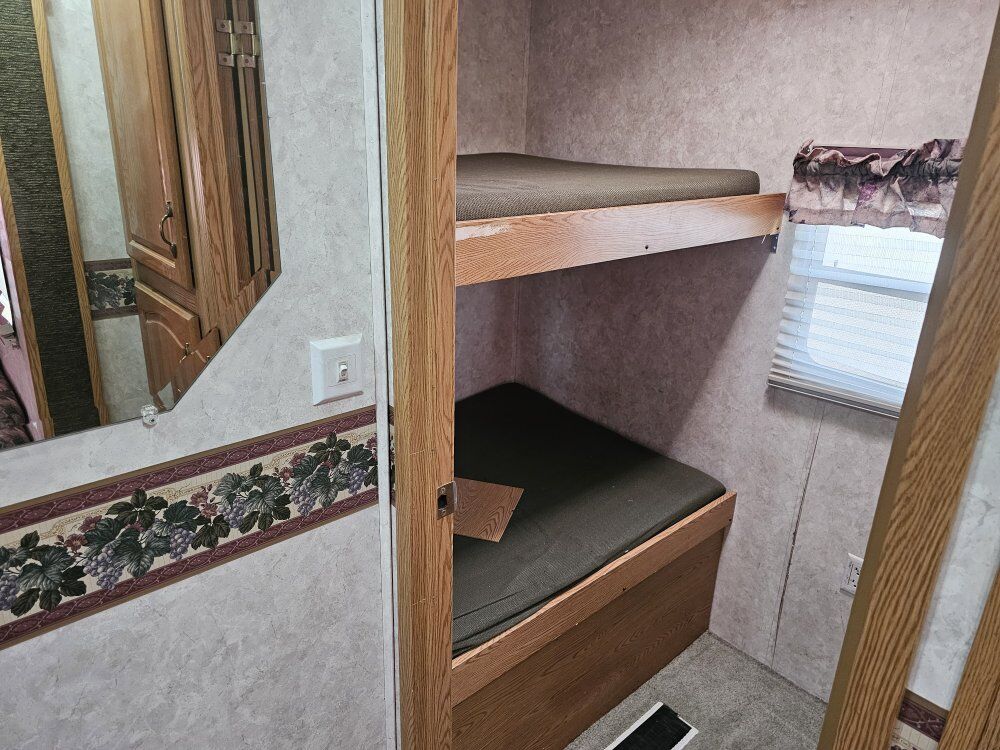 32 foot fifth wheel. bunk room in the back. had some roof damage from a tree limb. roof repaired. no water damage. new fridge and sewer vents. new stabilizer jacks, upgraded lithium batterys and convertor. everything worked last time it was used. restored title.