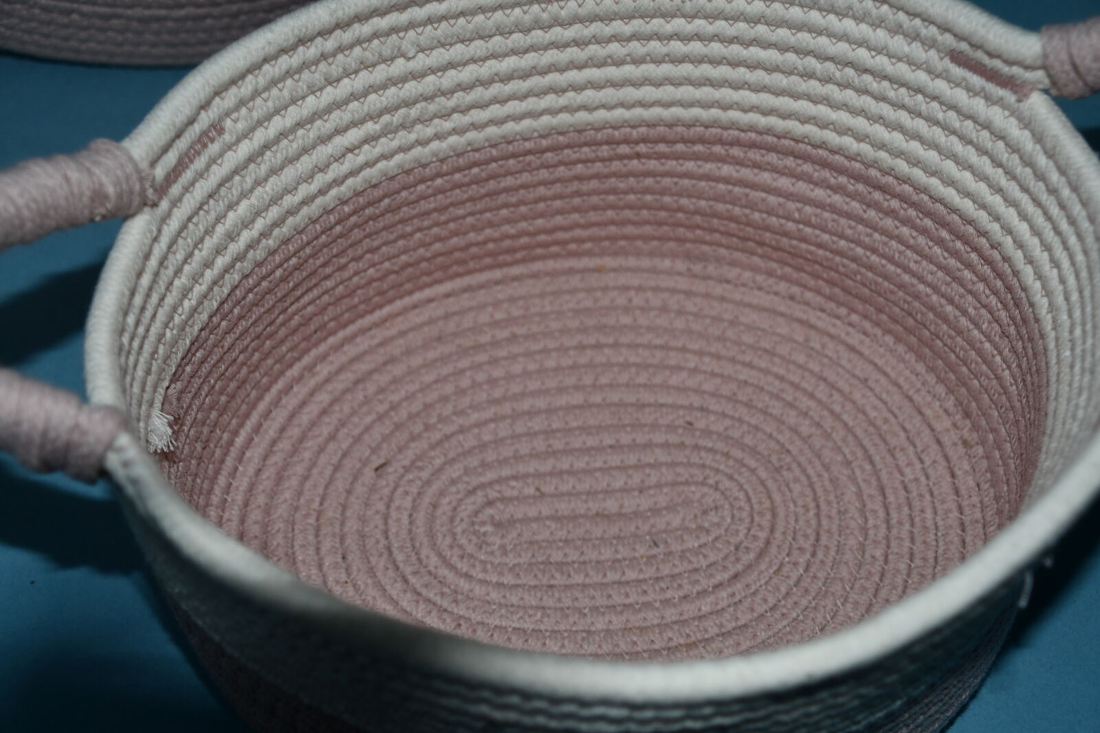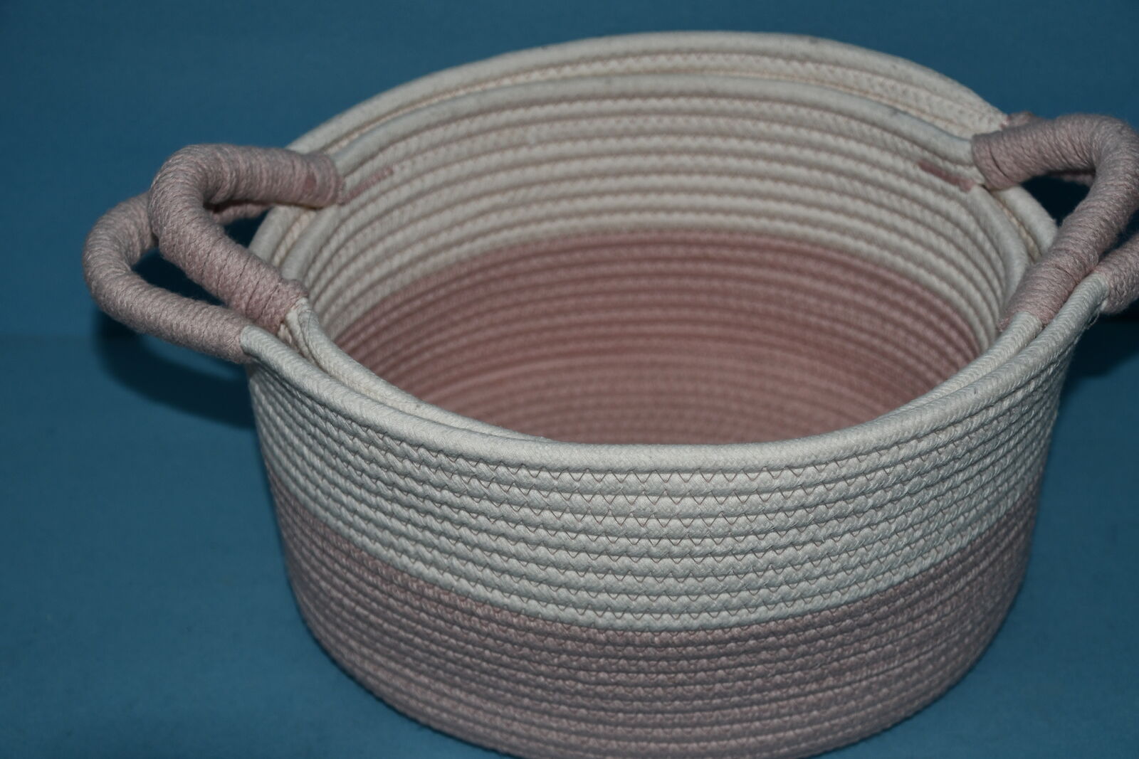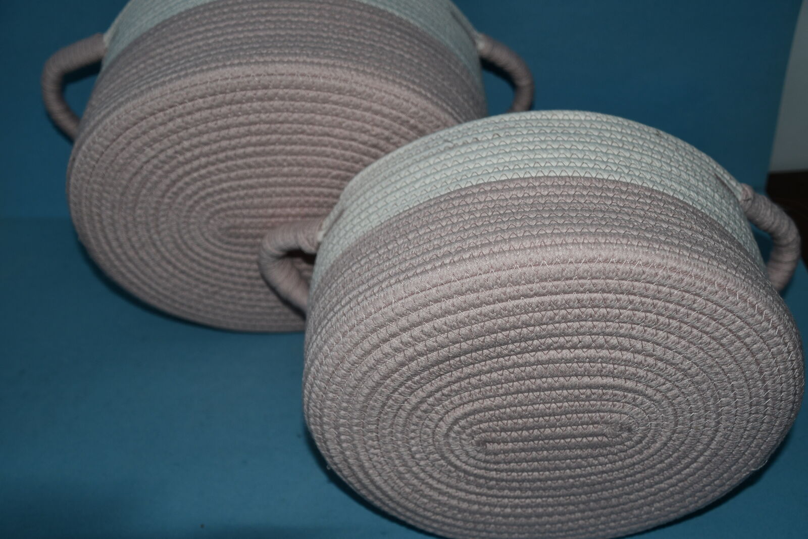 This SET of 2 PINK & WHITE STORAGE BASKETS are about 10" x 12" x 7" and 9" x 11" x 6". They nest for storage. They are CLEAN! Our home is smoke free. Questions??? Please ask. We are