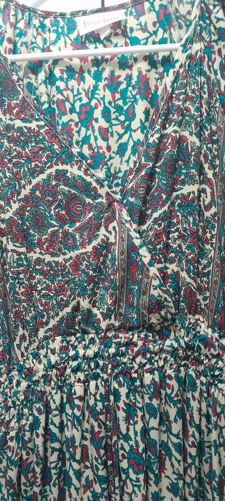 Effortless Elegance: Adorned with a rich, vibrant floral print in tones of deep blue, crimson, and teal, this dress transitions seamlessly from a sunny brunch to a twilight gathering..