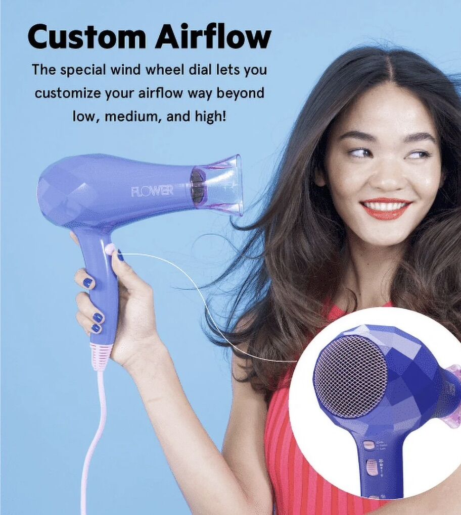 VenmoFaster Drying: We're all busy. That's why this dryer is one of the fastest working dryers at any price. You'll get fabulous flowing hair quickly and easily. The energy-efficient, aerospace-designed airflow system makes this more powerful than a 2000 watt dryer without wasting your energy. You're in control: Let me let you in on a secret that one of my professional stylists told me a long time ago. Just putting a dryer on high and blasting it, is no way to style hair. That's what the FLOWER dryer uses our special Wind Wheel dial, which lets you perfectly adjust the airflow to fit the styling you want. High for fast dry or dial it down for a more luxurious low out and anything in between. Not heavy: I hope you'll be pleasantly surprised that you can get salon-quality results with such a lightweight dryer. Pick it up. It actually weighs less than your cell phone. It's not heavy at all, but you'll love how wonderfully it works. • Lightweight and powerful • Ultra Lightweight (13.5 oz.) • Advanced airflow system, more power than a 2000W dryer • Turbo lonic Switch • Tourmaline Ceramic • Wind Wheel Airflow Dial • 2 Heat Settings and Cool Shot button • 9' Power Cord • Includes: Concentrator nozzle For all hair types