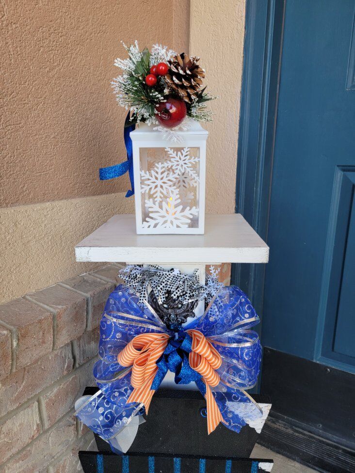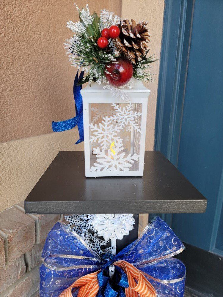 What's included: • Solid wood post construction with exterior black/white painted finish • Cast iron decorative hook (Vintage Style) • Holiday/Seasonal Sign or Wreath • Lighted Lantern Topper/Fixture- Batteries Included • Decorative bows and garland (Bows may be different than pictured) • Ready to display right now