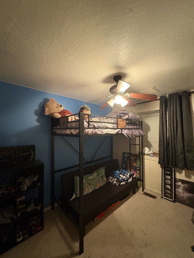 Great condition! Used about a year & my son out grew it is why I'm selling. Comes with all the hardware to put together! Really nice set! Doesn't come with the mattress.