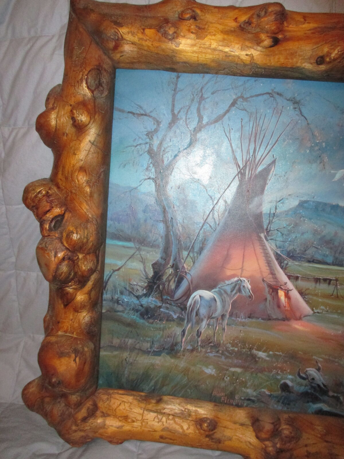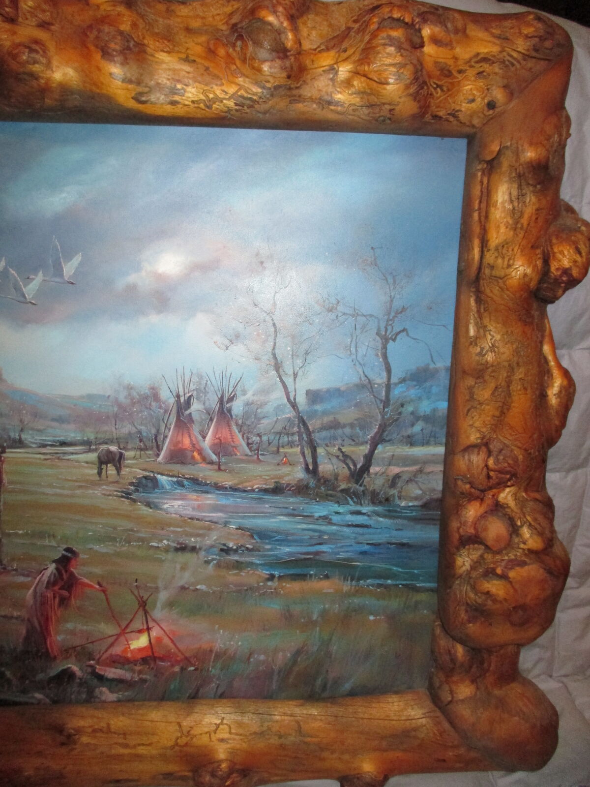 Original oil on board by Hulan Fleming. Framed in custom made burlwood rustic setting. Large 32 x 48 inches, wired and ready to hang.