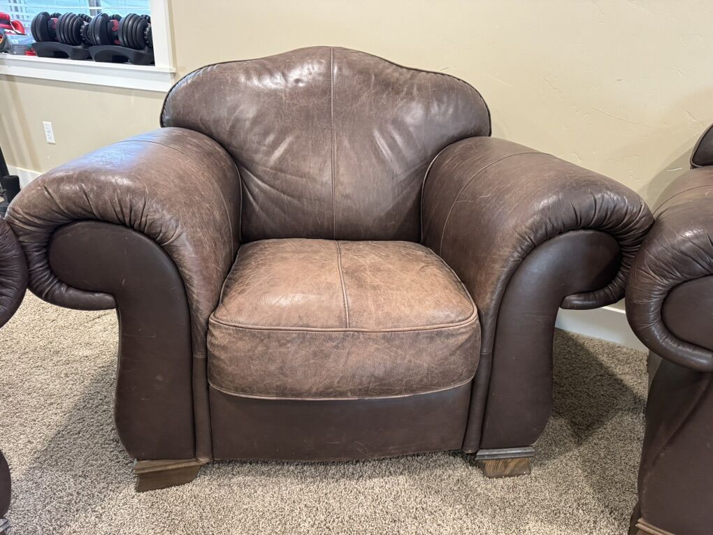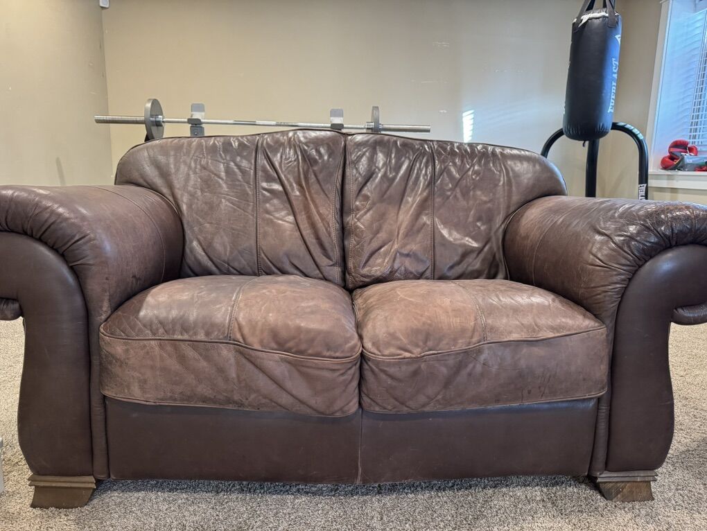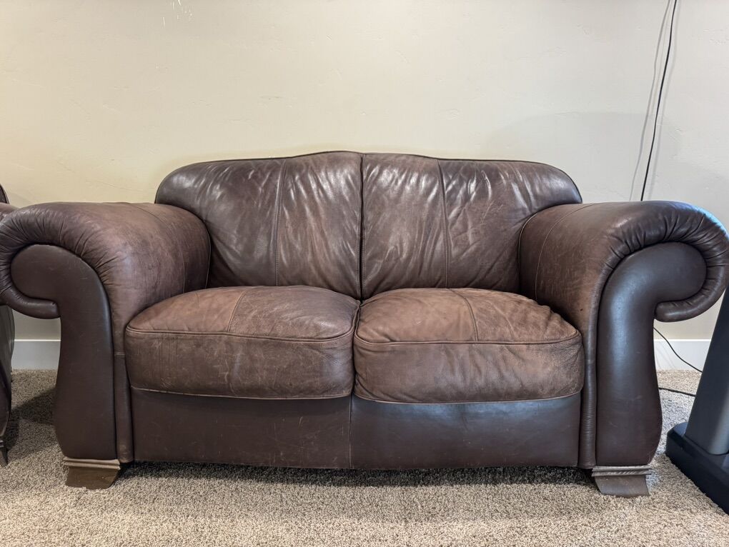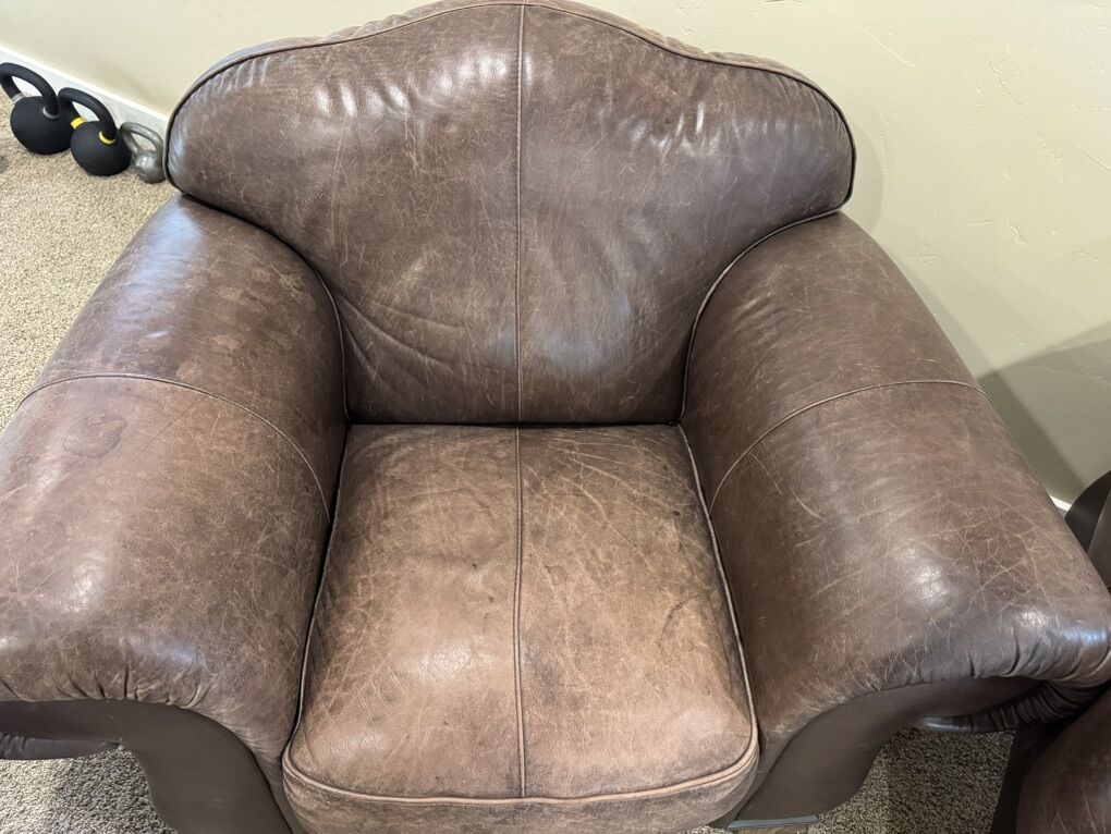 This has been a great seating set. Some faded spots but no tears. A good coat of leather conditioner and they will look great again. One armrest on one of the couches is more worn than the rest of the set. Comes from a clean home- no smoking / no pets. Call or text with questions.