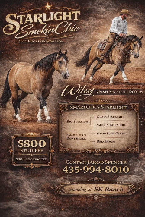 Introducing STARLIGHT SMOKINCHIC, better known as Wiley, a 2022 Buckskin Stallion built for breeders who want color, cow, and credibility wrapped into one intelligent breeding decision. Wiley represents a strategic cross for programs that demand proven lineage without inflated pricing, standing 15H, weighing 1,200 LBS. His sire line Rio Starlight earned $40,000 LTE, bringing forward the elite influence of Grays Starlight on top and Smokin Kitty Rio on the bottom, a cross known for, trainability, and cow sense. Grays Starlight himself is a proven icon with $35K LTE and over $12 million in progeny earnings, anchoring Wiley in one of the most commercially dominant bloodlines in the cutting and reined cow horse industries. On the dam side, SmartChics DontSmoke is by Smart Chic Olena, an NRCHA cornerstone with $167,471 LTE and over $15 million in progeny earnings, out of a Deja Boom mare, adding stopping power, grit, and elite versatility to the genetic equation.