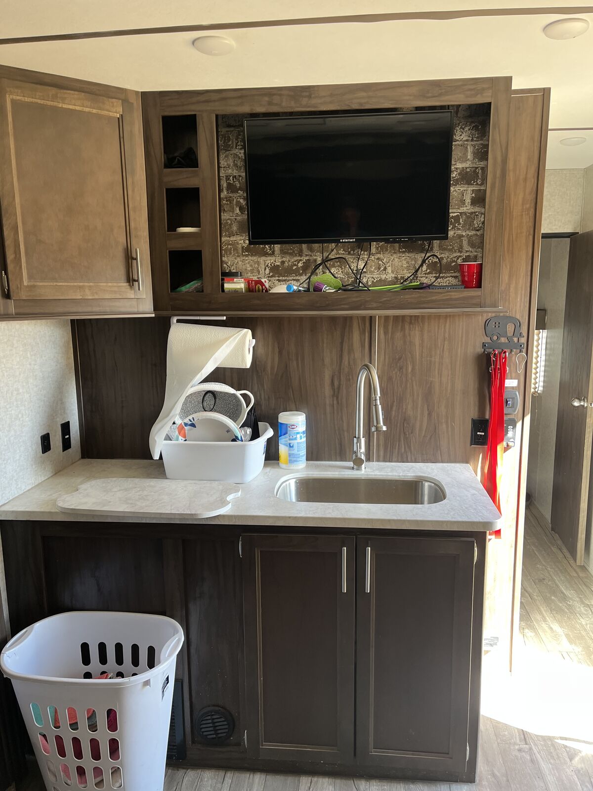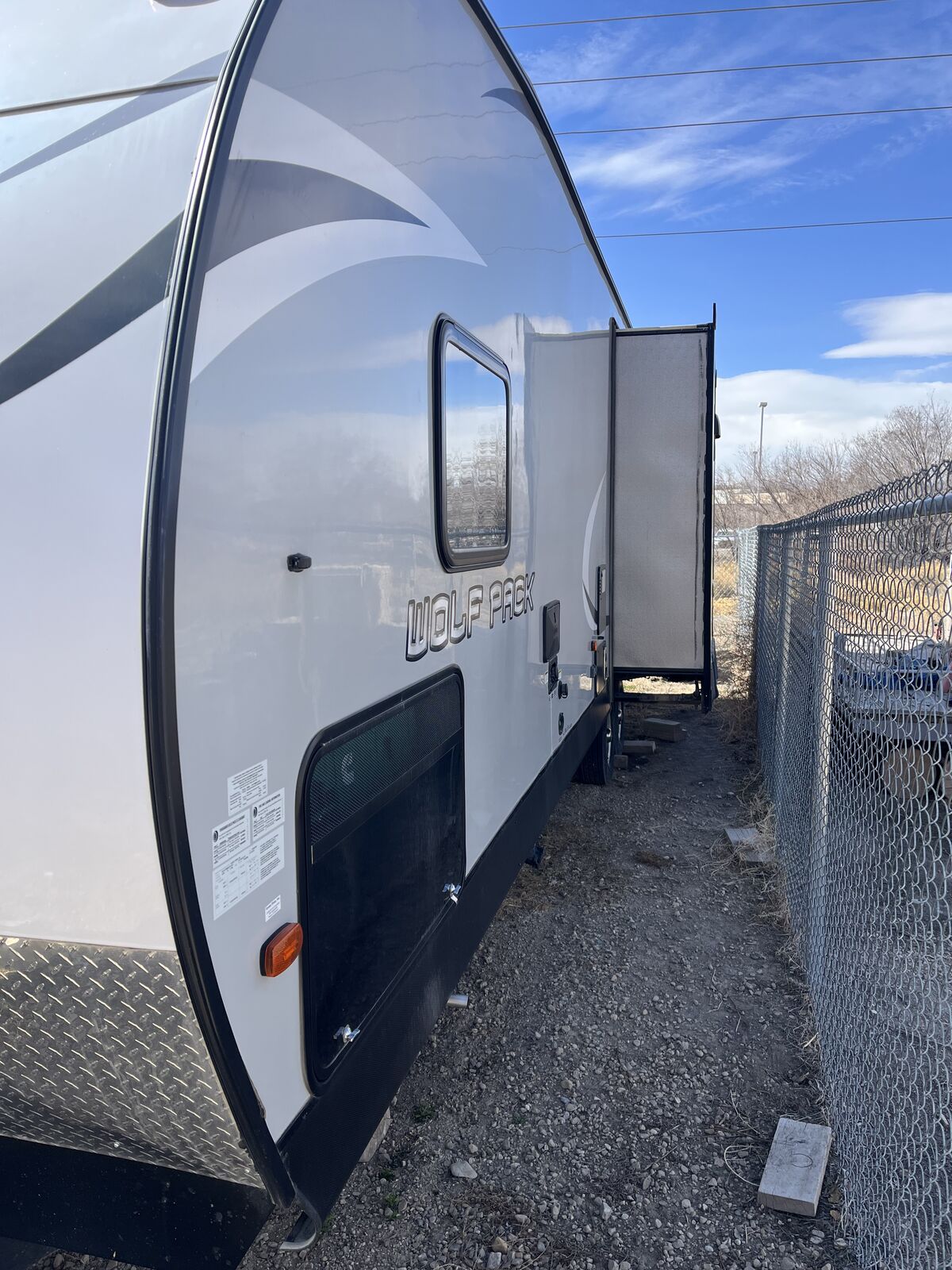 32’ wolf pack toy hauler with tip out generator can fit 2 4 wheelers or a four seat side by side comes with equalizer hitch solar panels wheel chocks new tires put on last year used once rear camera and tire pressure monitoring system call or text Jason (435)650-5583