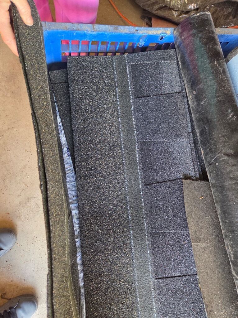 Left over roofing materials good for small shed or dog house 3 1/2 bundles, misc rubber under layment.. $80.00