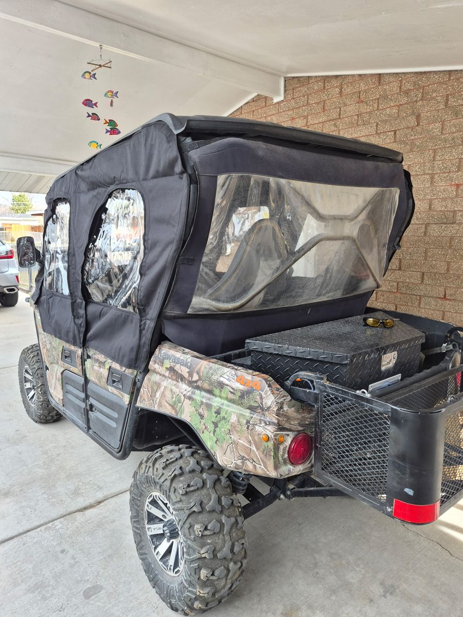 2016 Kawasaki Teryx4 Camouflage 4 seat Side by Side. Includes new full enclosure Yearly maintenance completed 3900 miles. Street Legal Kit Installed. Light Bar up front, Has a 2” lift kit installed. 2 piece windshield that can open all the way or part way for fresh air has hand operated windshield wipers. Chrome wheels, Newer 8 ply tires, Roof, Tool Box in the bed, yearly maintenance done, Hitch, Wench, New Battery, Battery tender, Rear plastic Enclosure. Added an extended bed great for your extra Gear. Rugged yet a comfortable ride. Handles trails and back country with ease. Also Included a mounted gun rack. It’s an awesome machine and in Great Condition. Asking $8,650 OBO Thanks for looking. You can also text if interested 801-631-3628.