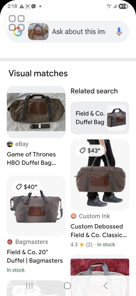 Product Description Custom Field and Co. Classic 20" Duffel Bag Made of cotton canvas, features a large main compartment and unique Field & Co.® details. Vinyl accents, front zippered pocket and durable handles. Sides can clip down when you are carrying less, or you can unclip the sides when the bag is fully stuffed. Also features trolley pass-through.