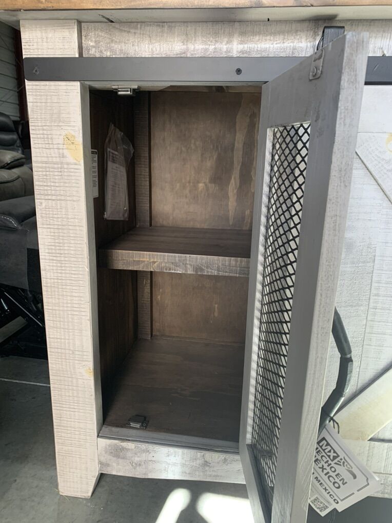 ApplePay100% solid pine offers great durability. Multi-step lacquer in a sophisticated Oyster finish. All shelves are fixed. Tv stands feature wire management on the back panel to accommodate several electronics. Doors feature iron mesh on panels.