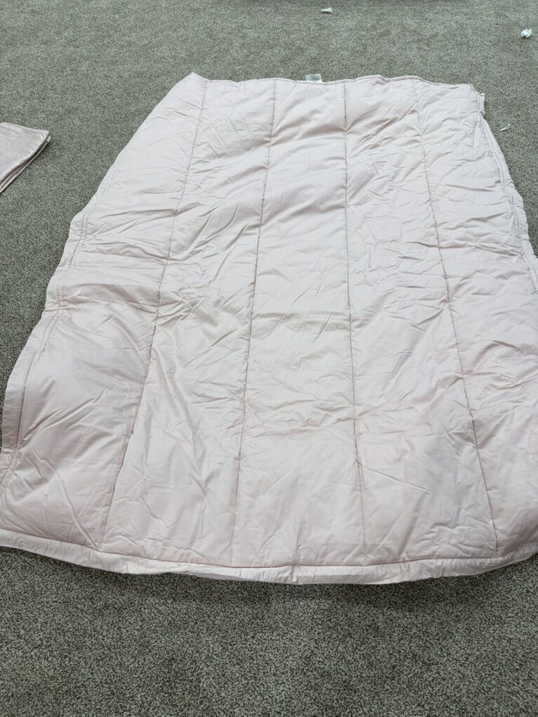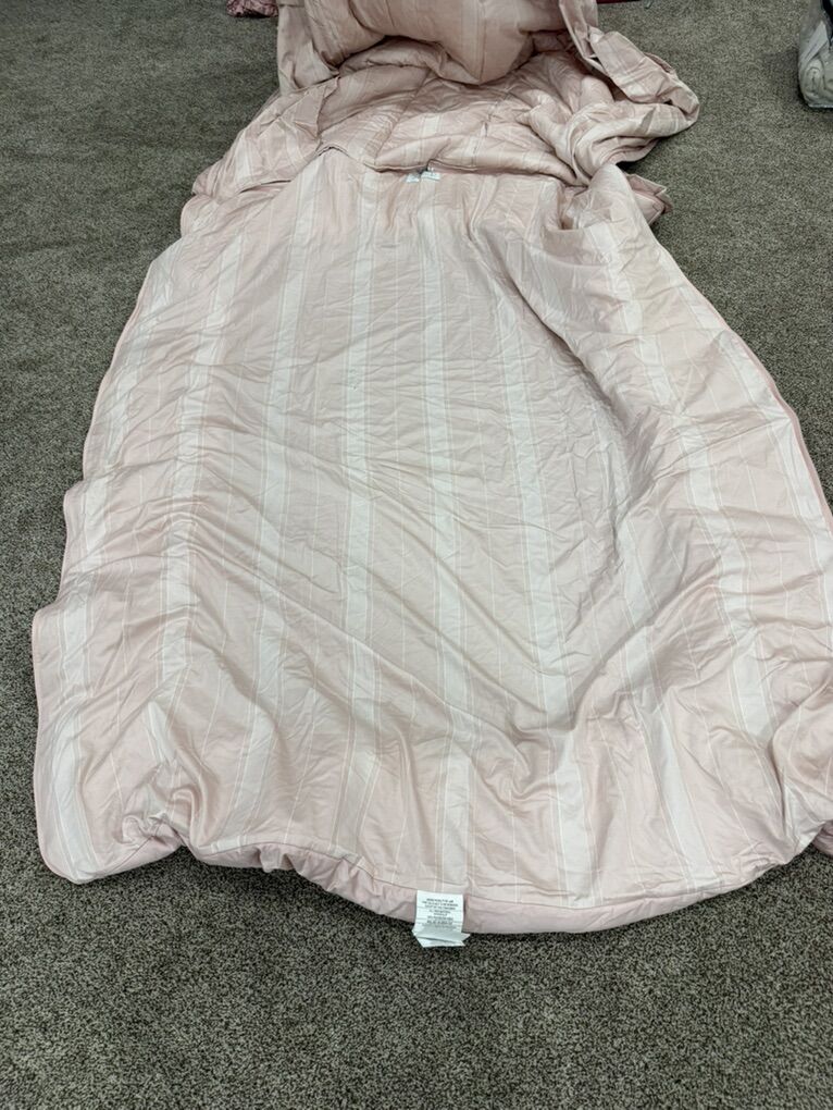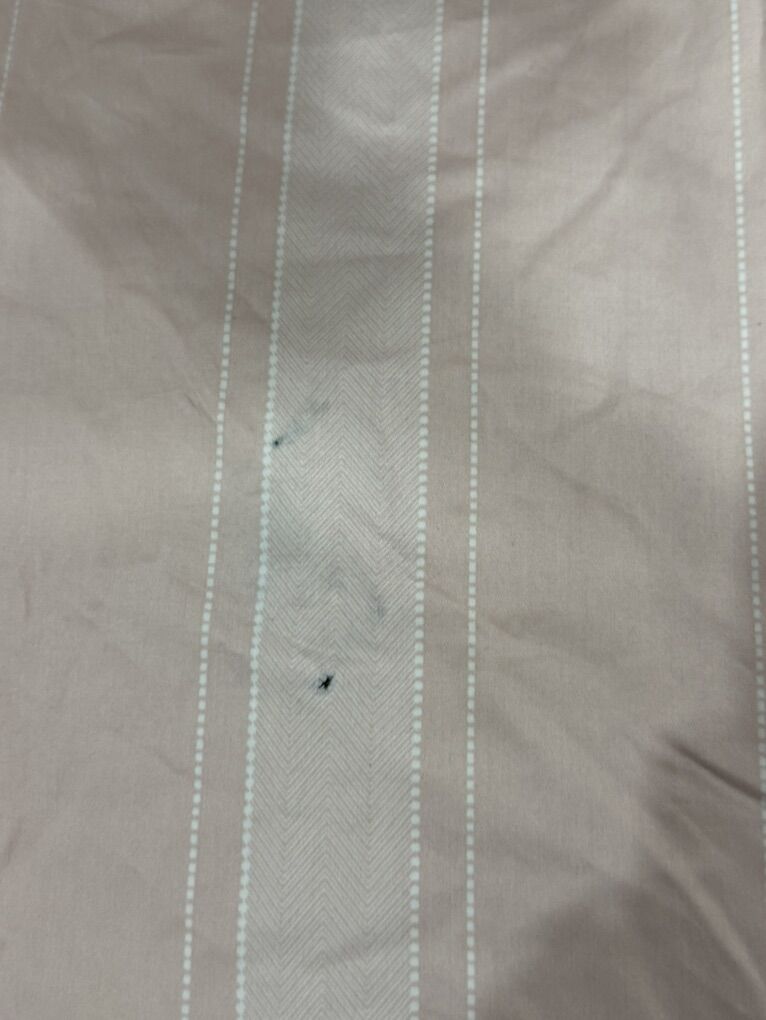 Has 2 shams and 2 cases, small stain area with 2 small holes in sheet and one at bottom; DEC68