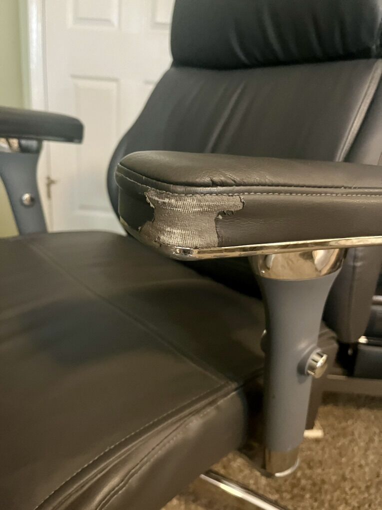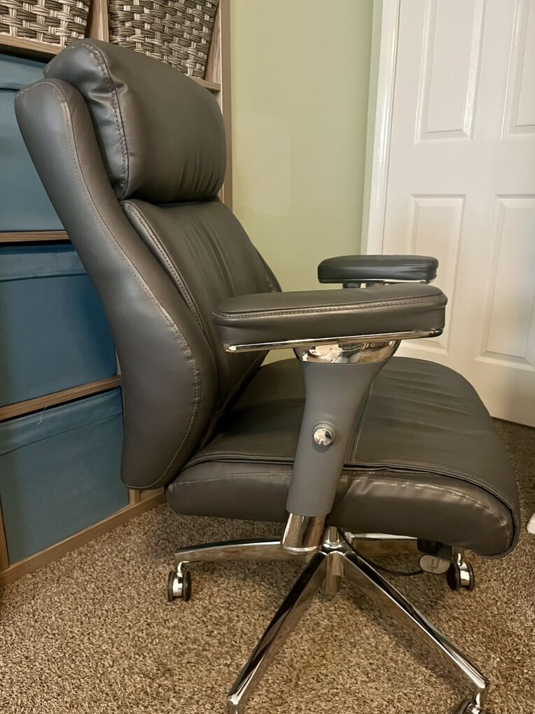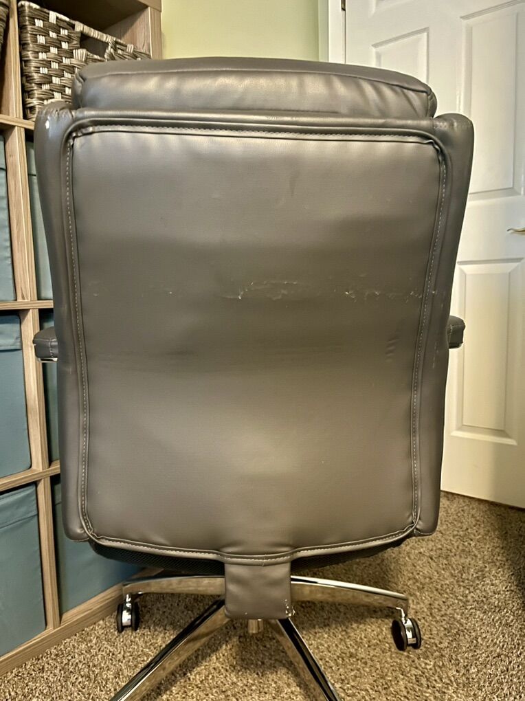 VenmoGray padded desk chair, adjustable height seat and arms, adjustable lumbar support, rolling wheels, back rocks/reclines. Some scuffing on front corner of left arm (pictured). Very comfortable! Measure 39x28x23 inches.