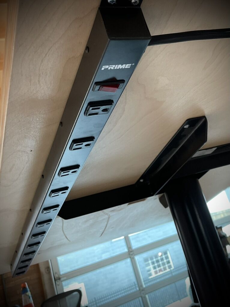 VenmoThis office table will seat 6 people. It has a power cord installed under the table top to charge electronics. You can run your power cords through the port in the middle of the table to mitigate cord chaos. This is a very sturdy table— not flimsy.