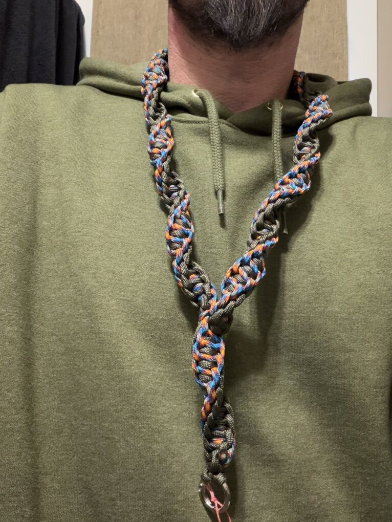 ZelleAwesome looking pair cord lanyards this style is called the DNA style not only has a an amazing look and looks thicker than most also carries 4 to 5 times more per cord length than your standard lanyard. Depending on the lanyard most roughly only hold about 25 feet to about 35 feet . This lanyard holds roughly 60 to 80 feet depending on the length you want . The best choice for Bushcraft or outdoor survival. These are the ones I have on hand if you don’t prefer any of these colors, let me know and I can always custom make whatever you want.