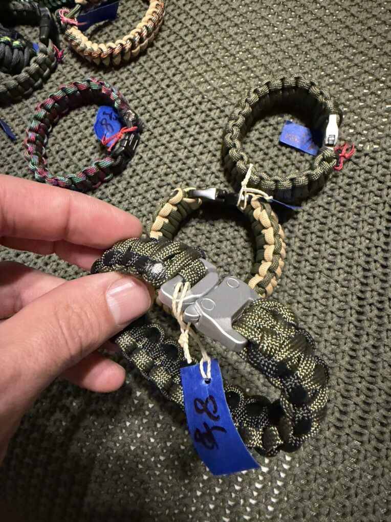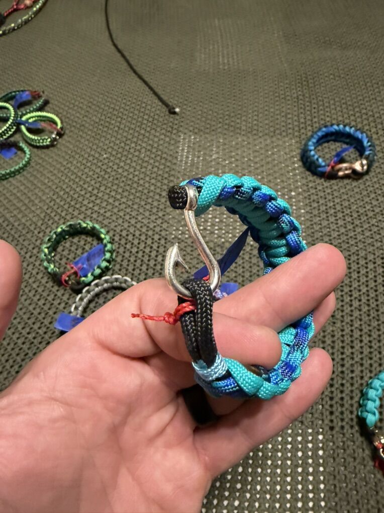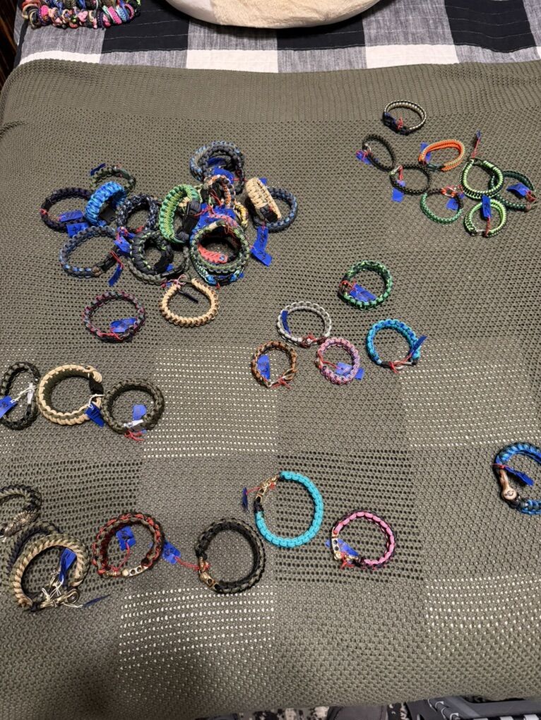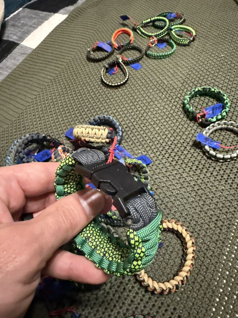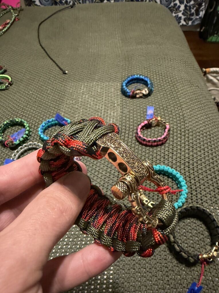 ZelleHandmade paracord bracelets. Can do many styles and different set ups. Bracelet with fish hook, or plastic buckle $7 With metal buckle $15 with fancy buckles $25