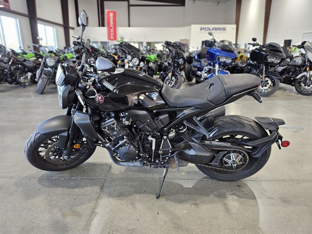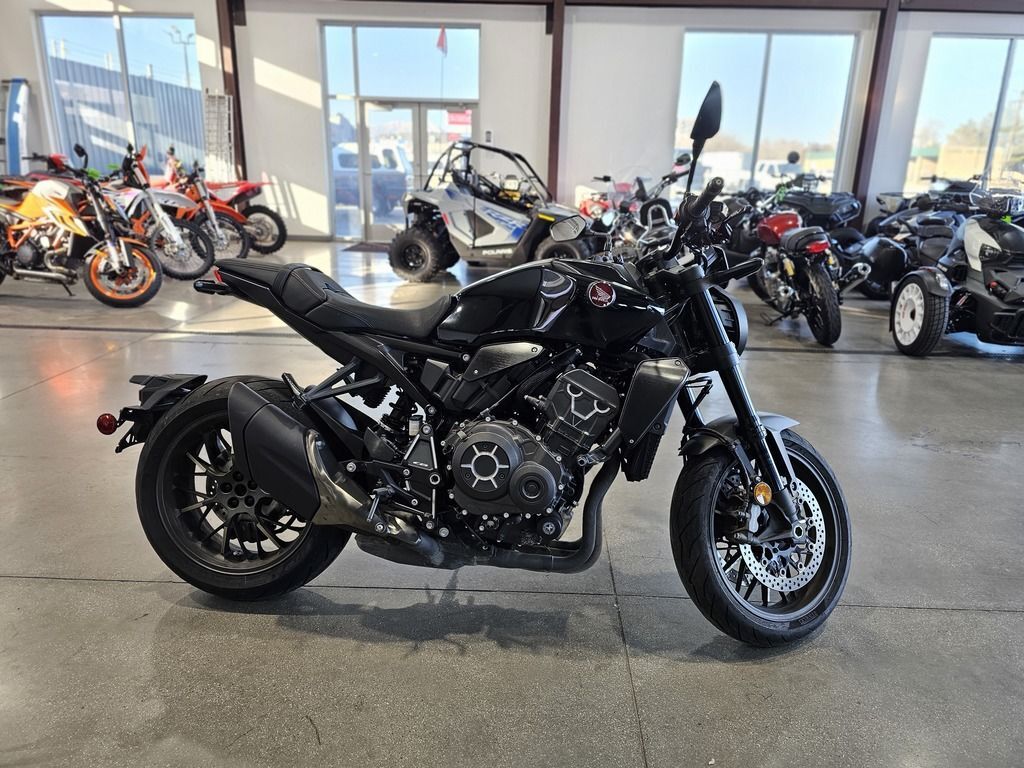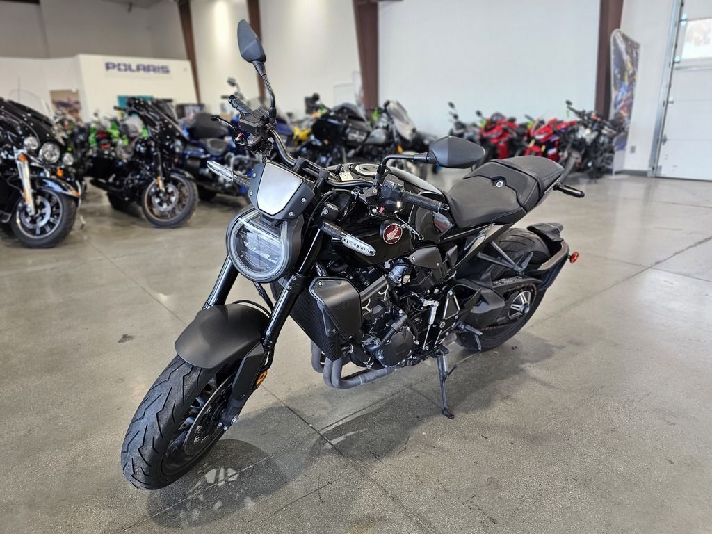 2023 Honda® CB1000R Black Edition THE ESSENTIAL SPORTBIKE A streetfighter is a modern sportbike with abundant raw horsepower, minimal bodywork, and plenty of attitude. That describes our Honda CB1000R Black Edition perfectly. Nothing gets between you and the pure essentials of the riding experience. Its high-revving liter-class four-cylinder engine is specially tuned for midrange and top-end power. The seating position is a little more open and relaxed than most pure sportbikes. And its graphic treatment is as powerful as its engine: black on black, understated yet elegant, and touched with some machined highlights. Modern touches include features like a digital instrument display, under-seat USB port, and a quick shifter. Are you ready to ride this awesome beast? We thought so. Features may include: ENGINEERING SLIPPER/ASSIST CLUTCH This innovative design hooks up tight to get all the CB1000R Black Edition’s power to the ground, yet still offers a light pull at the clutch lever. Plus, the slipper design helps mitigate rear wheel hop during aggressive downshifts and deceleration. PERFORMANCE INLINE FOUR ENGINE The CB1000R Black Edition’s powerful 998cc DOHC four-cylinder engine uses an architecture and layout proven on Honda superbikes. Forged (not cast) pistons make it as strong as it is powerful. COMFORT OPEN RIDING POSITION We call it the rider triangle—where you sit on the bike, where your feet rest on the pegs, and where your hands grip the bar. By opening up the triangle on the CB1000R Black Edition, you sit up a little straighter, which gives you a higher vantage point. Plus, most riders will find it a little more comfortable, too. STYLE BLACKOUT STYLING The CB1000R Black Edition is a standout both when it comes to performance and how it looks. And it hasn’t just been dipped in black paint either—we use special black plating and black anodizing on parts like the front suspension, rear subframe, swingarm-pivot plates, handlebar clamp, the entire exhaust system, and more. You can see in the photos how it looks—and it looks even better in person.